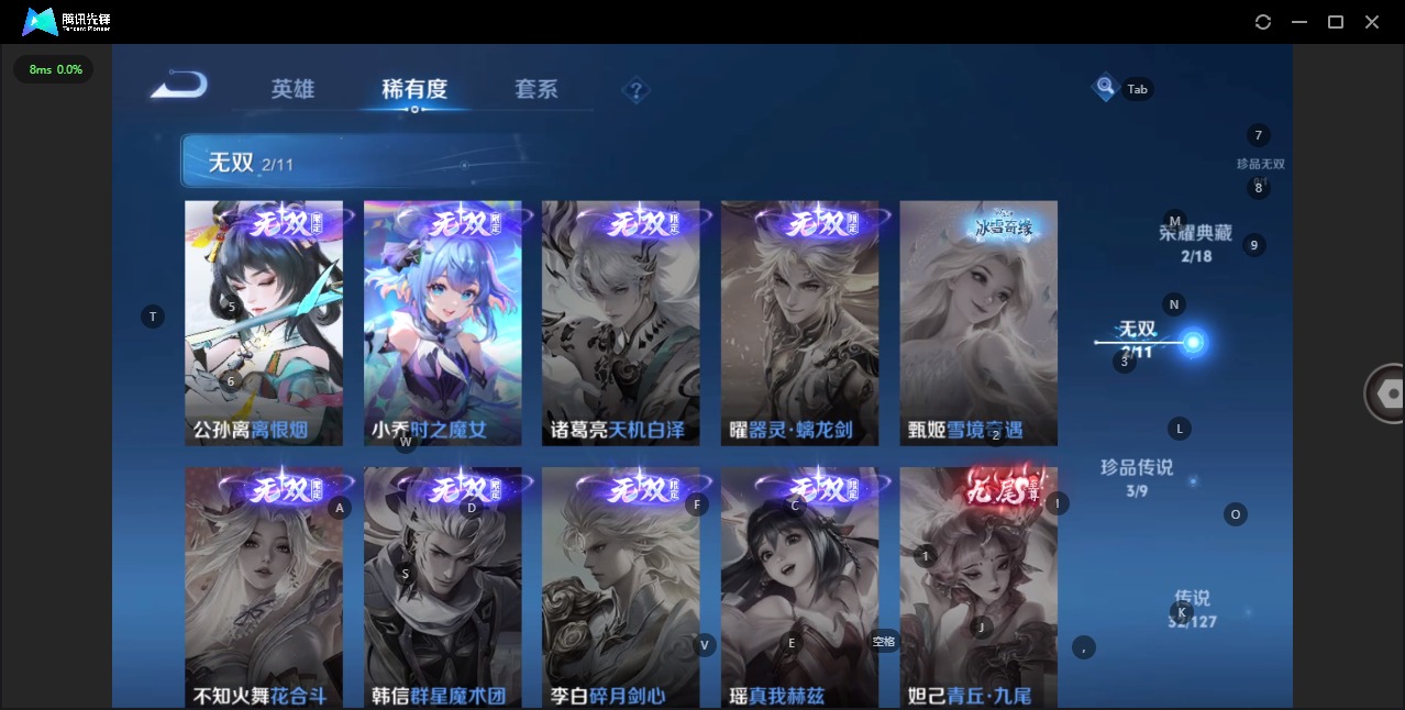 - [11764441]V8 1典藏 1无双 2珍品传说 18传说 112英雄 151皮肤 可修改实名 优质装备:星域神启(倪克斯贼亮),器灵·螭龙剑,怪盗基德,黄金狮子座,炽阳神光,时之恋人-刘备(电焊工),无双飞将,山海·炽霜斩(李信年限),燃星之曲,电玩·雷克斯,妄想实况,惊梅引,澜逐花归海 珍品传说:时之奇旅-孙策 传说皮:乘龙·问璇玑(孙尚香年限),乘龙·淬吴钩(孙策年限),幻光神枪 珍宝阁皮:万物之道 限定皮:愿照·九州拓(澜年限),愿照·岁时盈(虞姬年限),愿照·山河定(司空震年限),逐霄战戟,鸣野蒿,至尊宝,梁祝,玄武志(苏烈年限),百木心枪 史诗皮:器灵·浮梦炉,破空之剑,埋骨钱,琥珀纪元伽罗,乘龙·聚宝船(安琪拉年限),百相守梦-百里守约,星界特工,紫霞仙子,黄金分割率,特工魅影,匿光侦查者,鹤归松栖(赵怀真),真我赫兹(百里守约),无限星赏官,冰冠公主,偶像歌手,电玩·爆裂旋风,百相守梦(刘备),猫狗日记-大乔,时之恋人-孙尚香,节奏热浪,女仆咖啡,摇滚巨星,水果甜心,天才门将,星夜王子,暗隐猎兽者,鬼剑武藏,心灵战警,地狱岩魂,乘风破浪,曙光守护者,热力回旋,箭羽风息,金属风暴,圣诞恋歌,雪上飞焰,赏金猎手,未来纪元-赵云