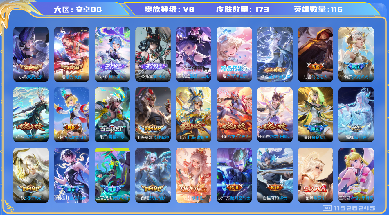 [11526245]V8 2典藏 2无双 3珍品传说 32传说 116英雄 173皮肤 可修改实名 优质装备:天鹅之梦(小乔典藏),小乔时之魔女(小乔无双),离恨烟(公孙离无双),拾光映像(瑶典藏),器灵·落星盏,酷洛米之心,大耳狗之梦,久胜战神,炽阳神光,时之恋人-刘备(电焊工),游龙清影(小青龙),超时空战士-狄仁杰,碎云,山海·琳琅生(小乔年限),炽翼辉光(娃娃菜牛角包),百相守梦(张飞),妄想奇谈,永恒水手月亮,小动物乐团,霜月吟,金乌负日 传说皮:乘龙·问璇玑(孙尚香年限),乘龙·铭钟鼎(赵云年限),乘龙·淬吴钩(孙策年限),貂蝉曦玄引,续相思,星之鸣奏 限定皮:愿照·九州拓(澜年限),愿照·福禄聚(蔡文姬年限),愿照·岁时盈(虞姬年限),愿照·山河定(司空震年限),愿照·众生和(妲己年限),愿照·千秋盛(女娲年限),映山客,鸣野蒿,星穹之声,绯月行,魔法小厨娘,至美·乘鲤谣,至美·化雀舞,遇见飞天,奇迹圣诞 史诗皮:鸭鸭历险记-刘禅,化蝶舞,星界战将,石田雨龙,百相守梦-周瑜,幻珠鲛人,战舞者,涂山红红,蔬乡物语(鲁班七号),乘龙·聚宝船(安琪拉年限),乘龙·忆丹青(大乔年限),百相守梦-黄忠,遇见神鹿,紫霞仙子,黄金分割率,永昼,江河有灵,浮梦罗烟,百解令(蒙犽),无限星赏官,冰冠公主,青蛇,偶像歌手,晚萤,电玩·兔顽号,暗夜猫娘,银翎春语,猫狗日记-大乔,女仆咖啡,水果甜心,心灵骇客,鬼剑武藏,乐园奇幻夜,诗语江南,拒霜思,缤纷独角兽,逐浪之夏,月团寄思,水晶猎龙者,原初追逐者,鹰眼统帅,暗夜贵公子,魅力维加斯,滕王阁序
