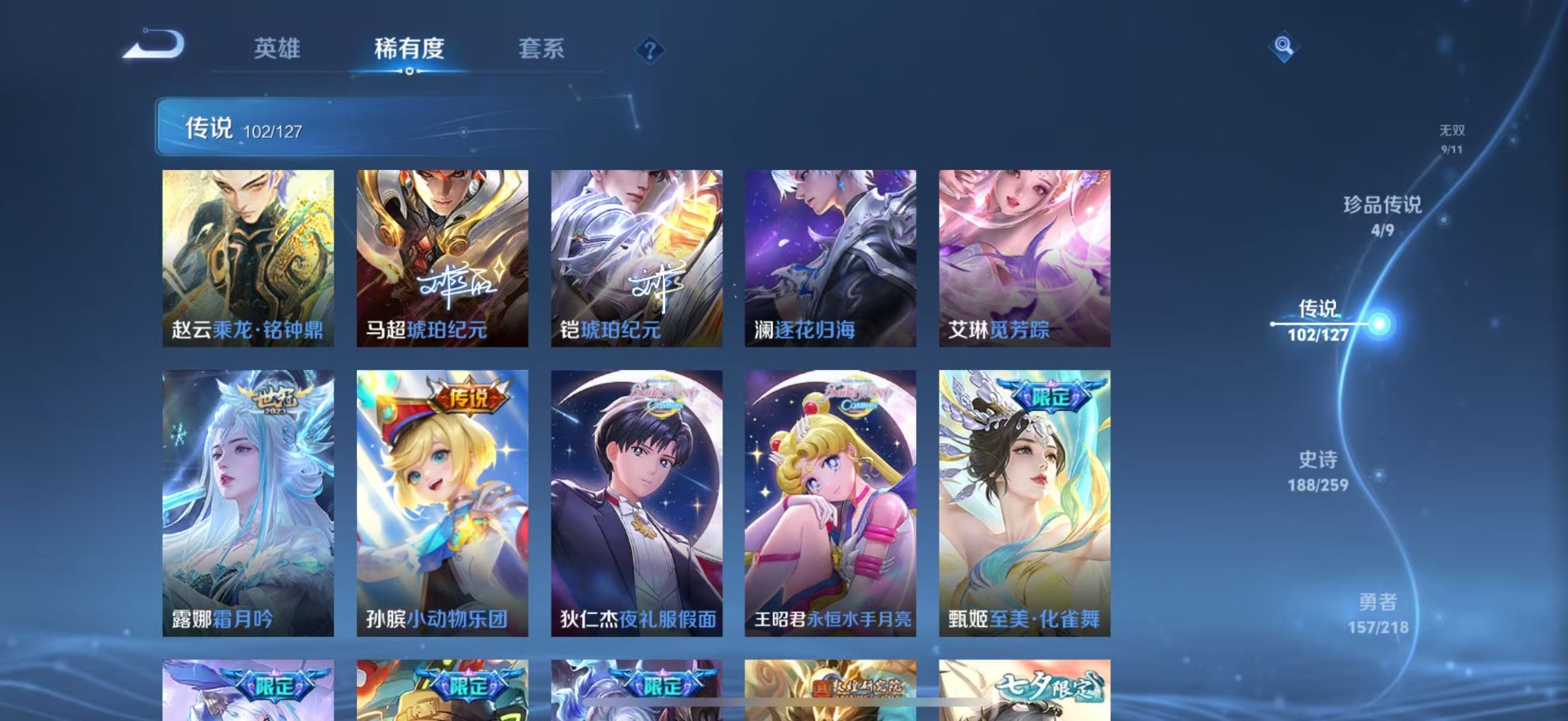 刘备时之恋人,小乔音你心动,李信一念神魔,孙尚香音你闪耀,孙尚香乘龙·问璇玑,露娜霜月吟,镜炽阳神光,朵莉亚心动手记,周瑜音你心动,貂蝉猫影幻舞,张良黄金白羊座,曜云鹰飞将,云中君群星魔术团,墨子黄金天蝎座,澜逐花归海,虞姬云霓雀翎,貂蝉曦玄引,王昭君永恒水手月亮,大乔挚爱花嫁,大乔时之奇旅,铠绛天战甲,铠琥珀纪元,赵云乘龙·铭钟鼎,孙膑小动物乐团,张飞百相守梦,干将莫邪久胜战神,典韦战鼓燎原,干将莫邪画中仙,孙策挚爱之约,孙策乘龙·淬吴钩,达摩黄金狮子座,海月金乌负日,王昭君乞巧织情,鲁班七号时之奇旅,吕布曦玄引,吕布遇见神鼓,后羿千劫归真,公孙离记忆之芯,亚连落雪白狼,夏洛特浮生妄,安琪拉追逃游戏,艾琳觅芳踪,西施游龙清影,亚瑟追逃游戏,狄仁杰神器·狴犴令,狄仁杰夜礼服假面,马超琥珀纪元,马超无双飞将,李元芳飞鸢探春,蔡文姬花朝如约,云缨幻光神枪