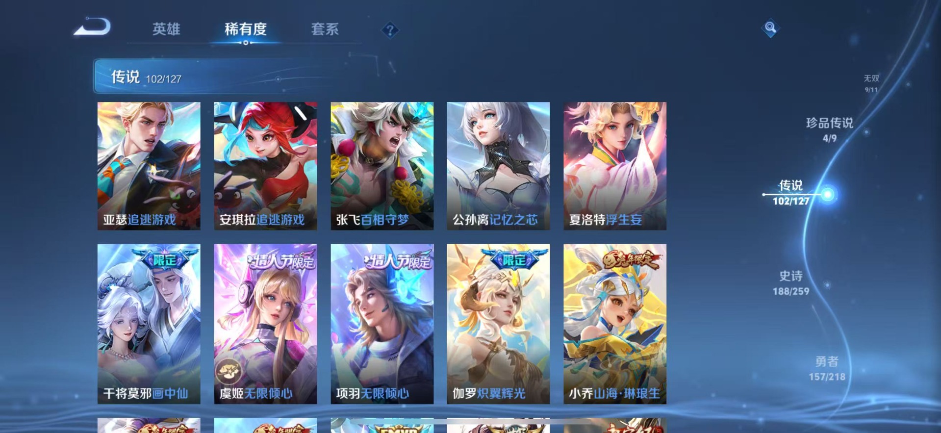 小乔天鹅之梦,诸葛亮星域神启,花木兰九霄神辉,韩信弑枪猎影,虞姬神鉴启示录,貂蝉幻阙歌,铠银白咏叹调,伽罗最初的交响,鲁班七号星空梦想,武则天倪克斯神谕,李白鸣剑·曳影,瑶拾光映像,关羽赤影疾锋