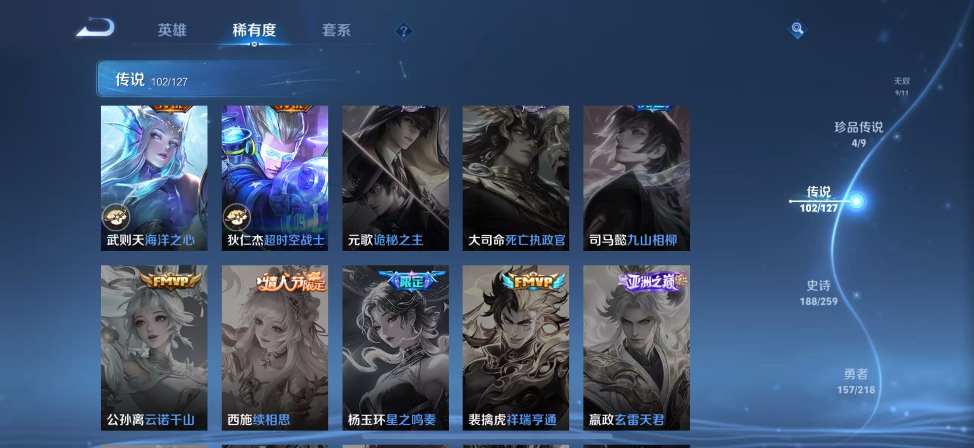 - PX_2104929-Q/至尊星耀/265皮肤/123英雄/0典藏/0珍品无双/0无双/0珍品传说/14传说/69史诗/7稀有英雄 【14 传说皮肤】胖达荣荣 梦奇,无双飞将 马超,地狱火 孙悟空,凤求凰 李白,猫影幻舞 貂蝉,地狱之眼 宫本武藏,炽阳神光 镜,黄金狮子座 达摩,一念神魔 李信,战鼓燎原 典韦,冠军飞将 花木兰,愿照·九州拓 澜,愿照·山河定 司空震,鸣野蒿 桑启, 【69 史诗皮