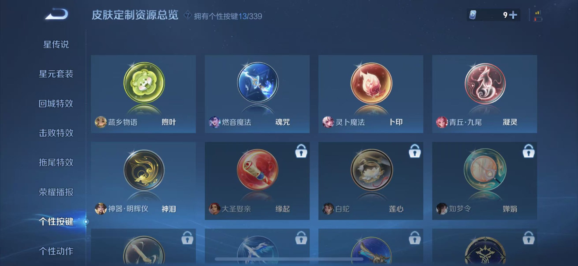 小乔时之魔女,不知火舞花合斗,曜器灵·螭龙剑,韩信群星魔术团,甄姬雪境奇遇,武则天神器·明辉仪,李白碎月剑心,妲己青丘·九尾,瑶真我赫兹