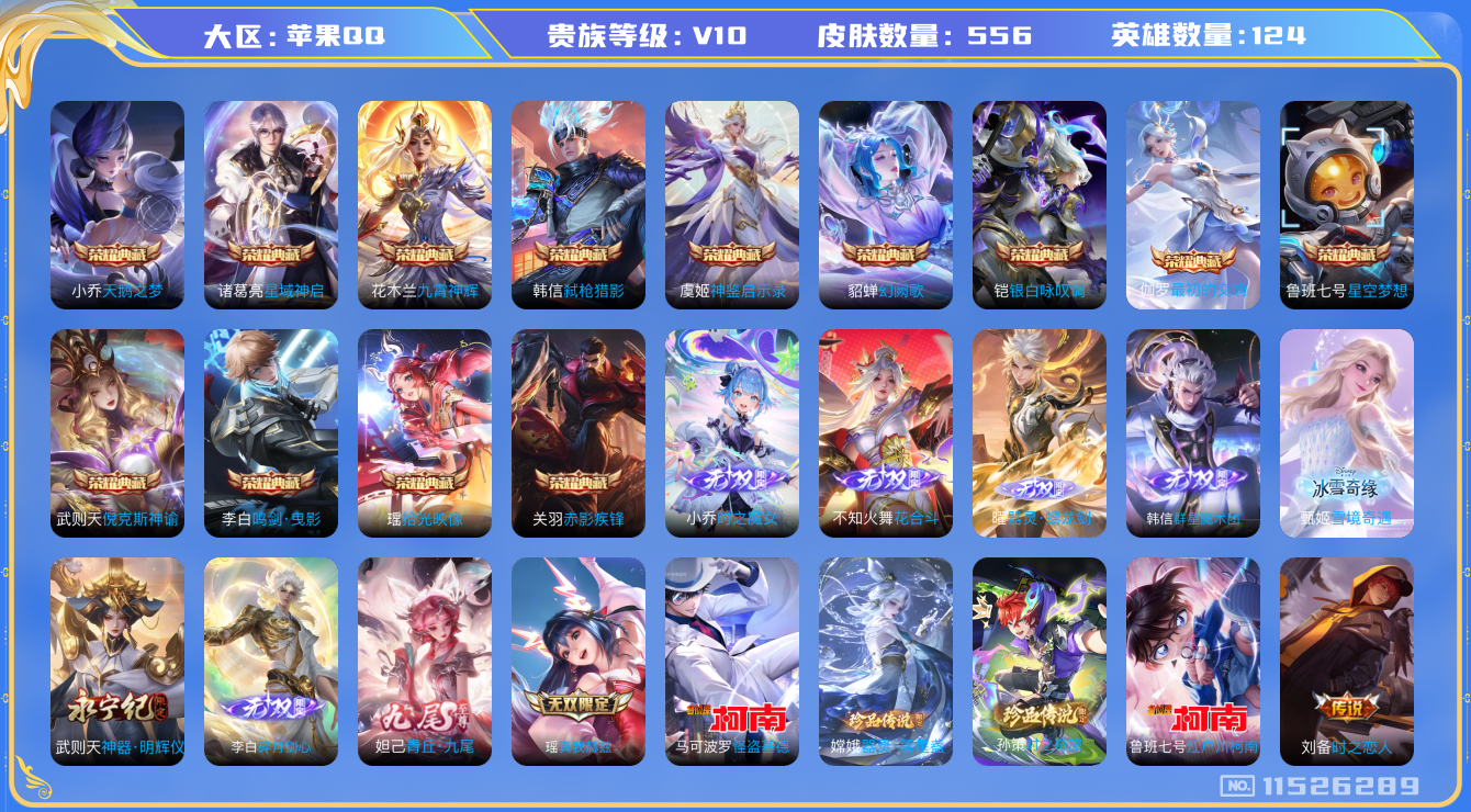[11526289]V10 13典藏 9无双 4珍品传说 102传说 124英雄 556皮肤 典藏英雄武则天 可修改实名 优质装备:天鹅之梦(小乔典藏),星空梦想(太空人),倪克斯神谕(宇宙婆娘),鸣剑·曳影,星域神启(倪克斯贼亮),九霄神辉(木兰典藏),赤影疾锋,银白咏叹调(倪克斯侍卫),幻阙歌(貂蝉典藏),弑枪猎影(韩信典藏),真我赫兹(瑶)(瑶无双),神器·明辉仪,青丘·九尾(妲己无双),碎月剑心(李白无双),神鉴启示录,小乔时之魔女(小乔无双),韩信群星魔术团(韩信无双),花合斗,拾光映像(瑶典藏),雪境奇遇-甄姬,器灵·螭龙剑,最初的交响(伽罗典藏),江户川柯南,怪盗基德,器灵·落星盏,黄金狮子座,黄金射手座,冠军飞将,云鹰飞将(小将军),绛天战甲(鸡嘴战神),黄金白羊座,猫影幻舞,久胜战神,炽阳神光,一念神魔,云霓雀翎,末日机甲-孙尚香(绿蚂蚱),地狱火,仲夏夜之梦(大飞蛾),音你心动-小乔,海洋之心,飞鸢探春,音你心动-周瑜,胖达荣荣,乞巧织情,时之恋人-刘备(电焊工),游龙清影(小青龙),超时空战士-狄仁杰,花朝如约(花篮子),挚爱之约,挚爱花嫁,无双飞将,音你闪耀(rap皮),神器·狴犴令,神器·明辉仪,山海·炽霜斩(李信年限),山海·琳琅生(小乔年限),山海·苍雷引(电光曜子),炽翼辉光(娃娃菜牛角包),画中仙,浮生妄,记忆之芯(机甲兔),青丘·九尾,百相守梦(张飞),追逃游戏(亚瑟),追逃游戏(安琪拉),电玩·雷克斯,鹤羽星尊,灼幽烈阳,妄想实况,妄想奇谈,鹤归松栖(云缨),遇见神鼓,鲁班七号-时之奇旅,大乔-时之奇旅,永恒水手月亮,夜礼服假面,小动物乐团,霜月吟,澜逐花归海,艾琳觅芳踪,琥珀纪元铠,琥珀纪元马超,金乌负日,黄金天蝎座,云中君群星魔术团,朵莉亚心动手记,千劫归真 珍品传说:时之奇旅-孙策 传说皮:乘龙·问璇玑(孙尚香年限),乘龙·铭钟鼎(赵云年限),乘龙·淬吴钩(孙策年限),貂蝉曦玄引,吕布曦玄引,典韦战鼓燎原,落雪白狼,幻光神枪 珍宝阁皮:妄想食味,优雅恋人,蔷薇恋人 限定皮:愿照·九州拓(澜年限),愿照·福禄聚(蔡文姬年限),愿照·岁时盈(虞姬年限),愿照·山河定(司空震年限),愿照·众生和(妲己年限),愿照·千秋盛(女娲年限),映山客,陌上桑,鸣野蒿,至尊宝,白虎志(电光耗子),凤求凰(白切鸡),凤凰于飞,太华(伽罗年限),武陵仙君(小桃