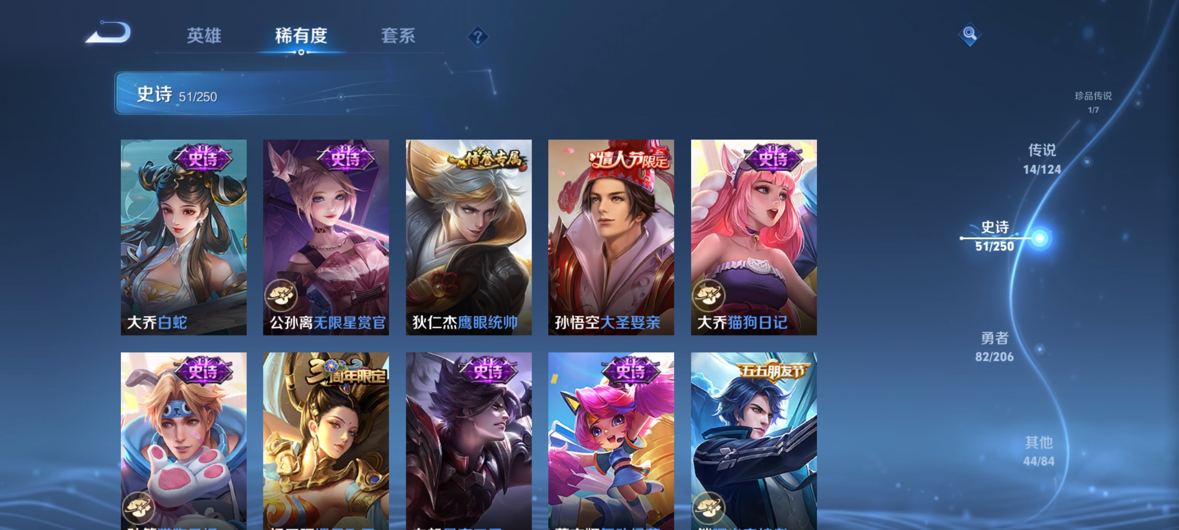 大乔白蛇,公孙离无限星赏官,大乔猫狗日记,孙策猫狗日记,露娜紫霞仙子,诸葛亮黄金分割率,项羽苍穹之光,白起星夜王子,刘邦德古拉伯爵,兰陵王暗隐猎兽者,曹操幽灵船长,宫本武藏鬼剑武藏,蔡文姬舞动绿茵,廉颇地狱岩魂,小乔缤纷独角兽,花木兰水晶猎龙者,铠曙光守护者,墨子金属风暴,吕布圣诞狂欢,貂蝉圣诞恋歌,百里守约特工魅影,貂蝉唤灵魅影,高渐离天秀·音浪,蒙犽百解令,高渐离燃音魔法,李白谪仙醉月,赵怀真器灵·浮梦炉