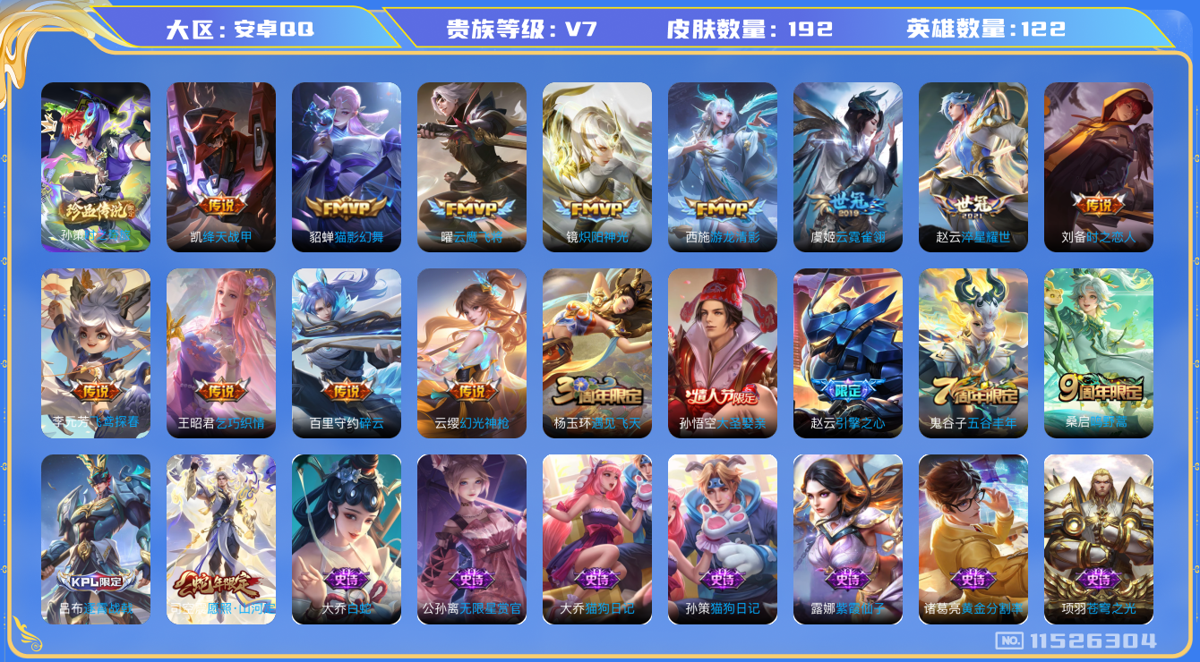 - [11350389]V7 1典藏 1珍品传说 12传说 123英雄 182皮肤 可修改实名 优质装备:鸣剑·曳影,怪盗基德,云鹰飞将(小将军),末日机甲-孙尚香(绿蚂蚱),超时空战士-狄仁杰,记忆之芯(机甲兔),鹤羽星尊,霜月吟 传说皮:貂蝉曦玄引,幻光神枪 珍宝阁皮:妄想食味 限定皮:愿照·千秋盛(女娲年限),鸣野蒿,补天,前尘镜,梁祝,李小龙,大圣娶亲 史诗皮:赞萌露比,器灵·浮梦炉,化蝶舞,星界战将,谪仙醉月,龙之律动,战舞者,蒙犽顽岩魄,琥珀纪元伽罗,百相守梦-百里守约,星界特工,百相守梦-黄忠,守夜人,电玩小子(小书包),特工魅影,永昼,冰冠公主,偶像歌手,晚萤,暗夜猫娘,龙骑士(小龙虾),节奏热浪,摇滚巨星,水果甜心,天才门将,心灵骇客,德古拉伯爵,暗隐猎兽者,鬼剑武藏,暗渊魔法,心灵战警,舞动绿茵,纤云弄巧,缤纷独角兽,逐浪之夏,月团寄思,水晶猎龙者,金属风暴,原初追逐者,圣诞狂欢,圣诞恋歌,鹰眼统帅,魅力维加斯,黎明之约,赏金猎手
