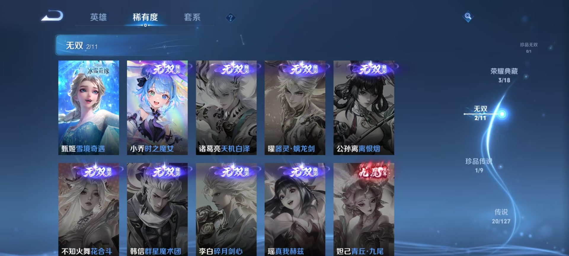 司空震愿照·山河定,裴擒虎李小龙,铠青龙志,女娲愿照·千秋盛,孙悟空至尊宝,盘古冰霜神祇,妲己时之彼端,妲己愿照·众生和,蔡文姬愿照·福禄聚,澜愿照·九州拓,虞姬愿照·岁时盈,关羽冰锋战神