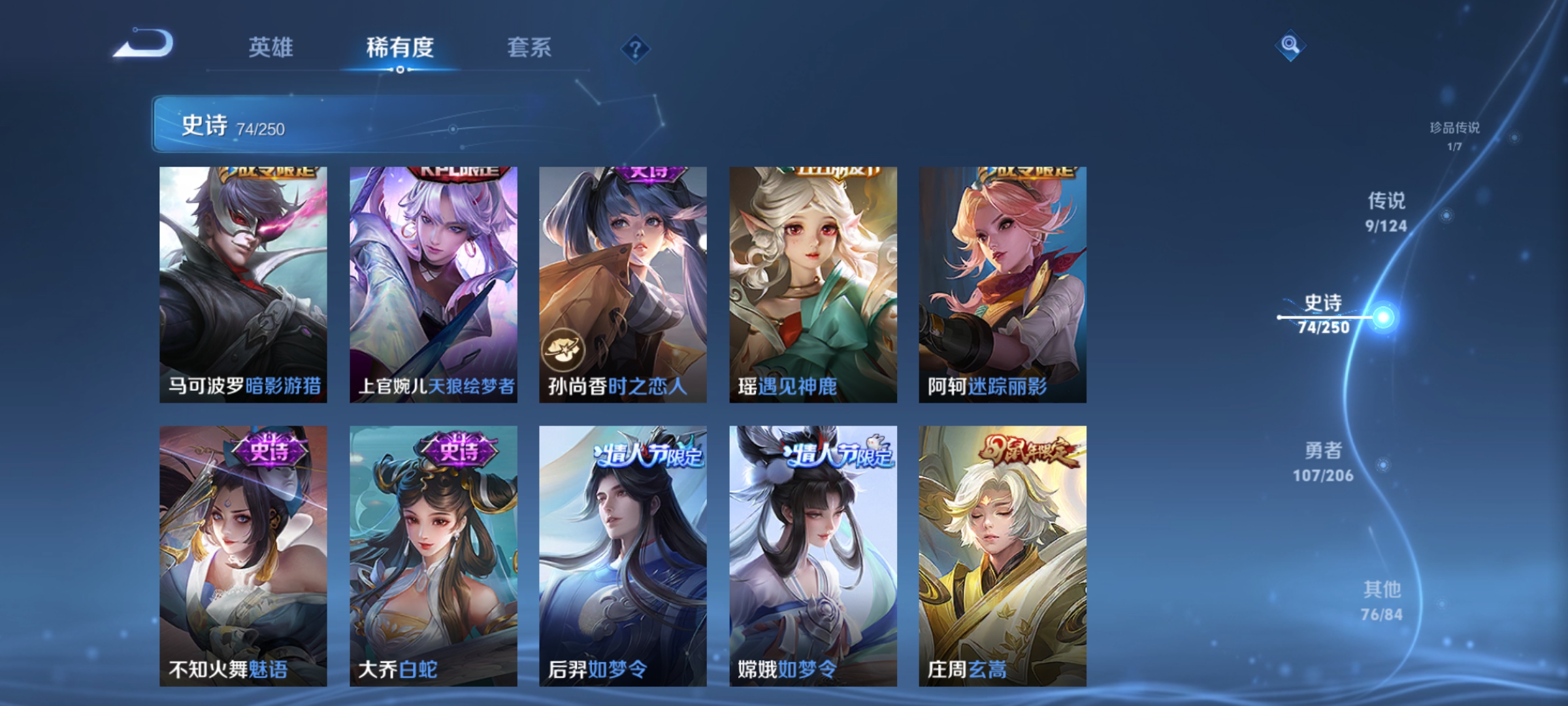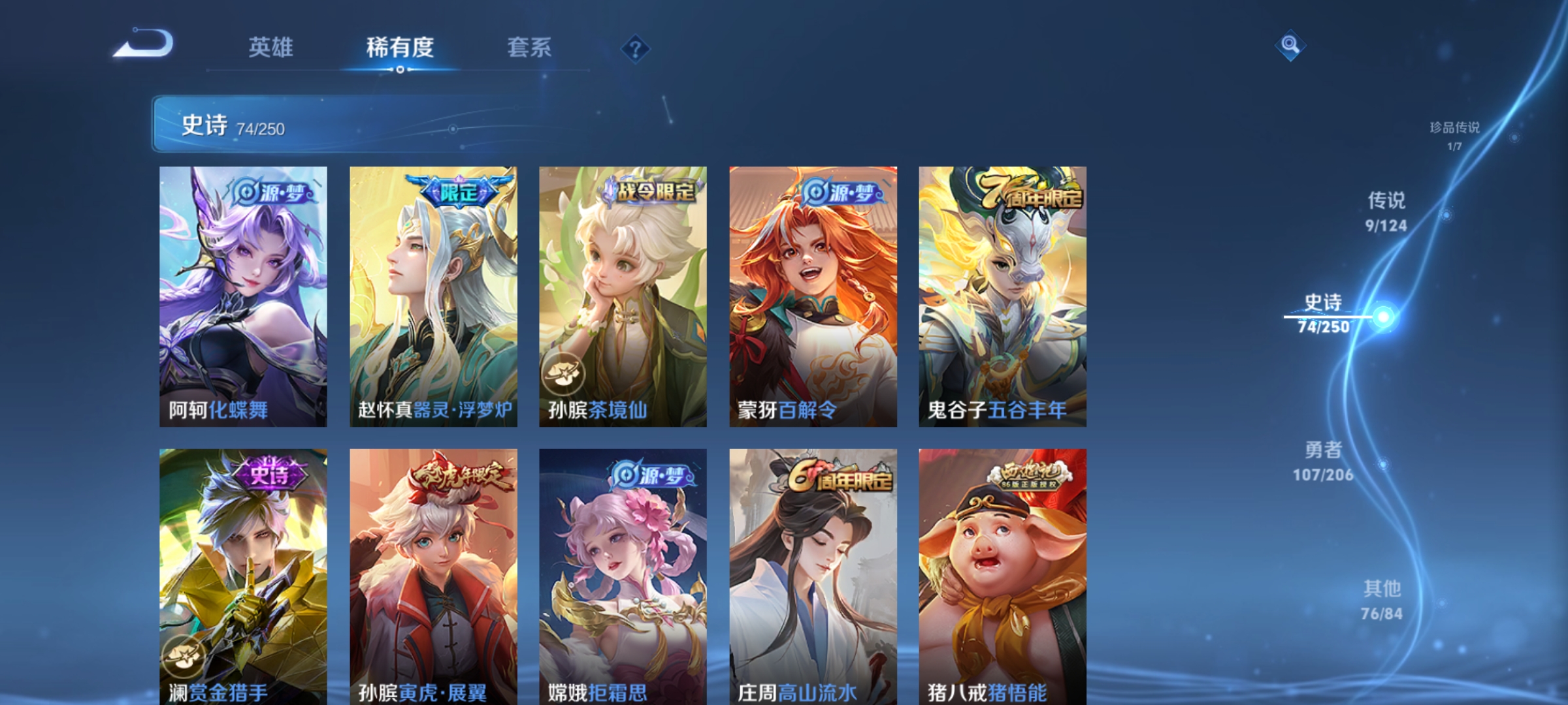 裴擒虎李小龙,上官婉儿梁祝,牛魔奔雷神使,张飞虎魄,庄周玄嵩,伽罗太华,孙膑天狼运算者,上官婉儿天狼绘梦者,虞姬霸王别姬,后羿如梦令,嫦娥如梦令,庄周云端筑梦师,猪八戒猪悟能,孙膑寅虎·展翼,妲己愿照·众生和
