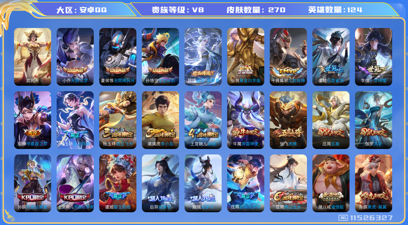 [11526327]猴子典藏,天鹅之梦,夏侯惇机甲,嫦娥珍传,武则天,妲己蛇年限,久胜,仲夏夜,太华,紫霞,-可二次-124英雄-270皮肤-3典藏-9传说-74史诗 太华-伽罗 奔雷神使-牛魔 冰冠公主-雅典娜 寅虎·展翼-孙膑 天狼绘梦者-上官婉儿 虎魄-张飞 街头霸王-韩信
