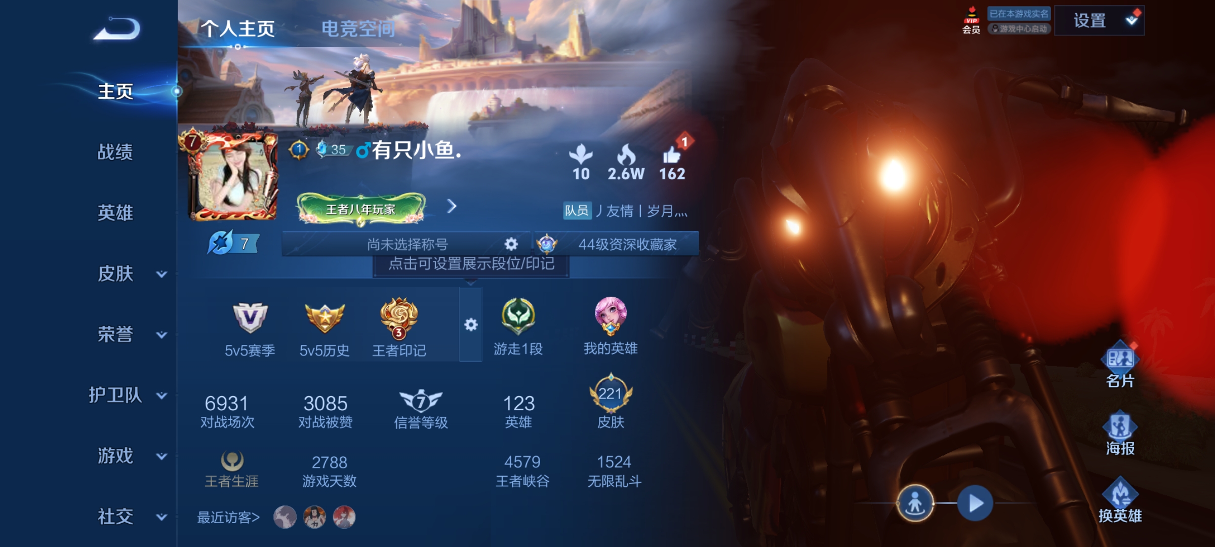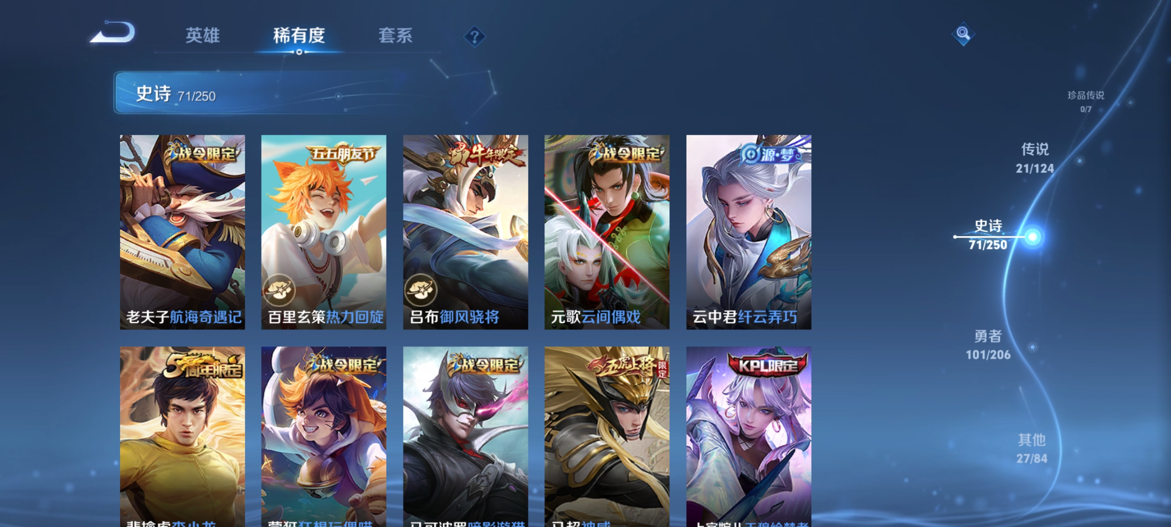 - [11632766]V7 1典藏 1珍品传说 6传说 123英雄 219皮肤 可修改实名 优质装备:最初的交响(伽罗典藏),末日机甲-孙尚香(绿蚂蚱),山海·炽霜斩(李信年限) 珍品传说:时之奇旅-孙策 传说皮:乘龙·铭钟鼎(赵云年限),幻光神枪 珍宝阁皮:万物之道,女武神 限定皮:愿照·九州拓(澜年限),逐霄战戟,鸣野蒿,五谷丰年,孙行者,寅虎·心曲(虎婆),唐三藏,山海·玄木吟(马可年限) 史诗皮:化蝶舞,星界战将,龙之律动,茶境仙,怒海争锋,破空之剑,蒙犽顽岩魄,芈月浮光幕影,海诺心动手记,琥珀纪元伽罗,蔬乡物语(鲁班七号),紫霞仙子,苍穹之光,千年之狐,真我赫兹(百里守约),百解令(蒙犽),高渐离燃音魔法,蒙恬荣光圣徽,偶像歌手,末日机甲-吕布,猫狗日记-孙策,节奏热浪,水果甜心,绅士熊喵,心灵骇客,时之奇旅-安琪拉,功夫厨神,鬼剑武藏,心灵战警,地狱岩魂,纤云弄巧,拒霜思,乘风破浪,逐浪之夏,箭羽风息,唤灵魅影,金属风暴,圣诞狂欢,鹰眼统帅,魅力维加斯,未来纪元-赵云