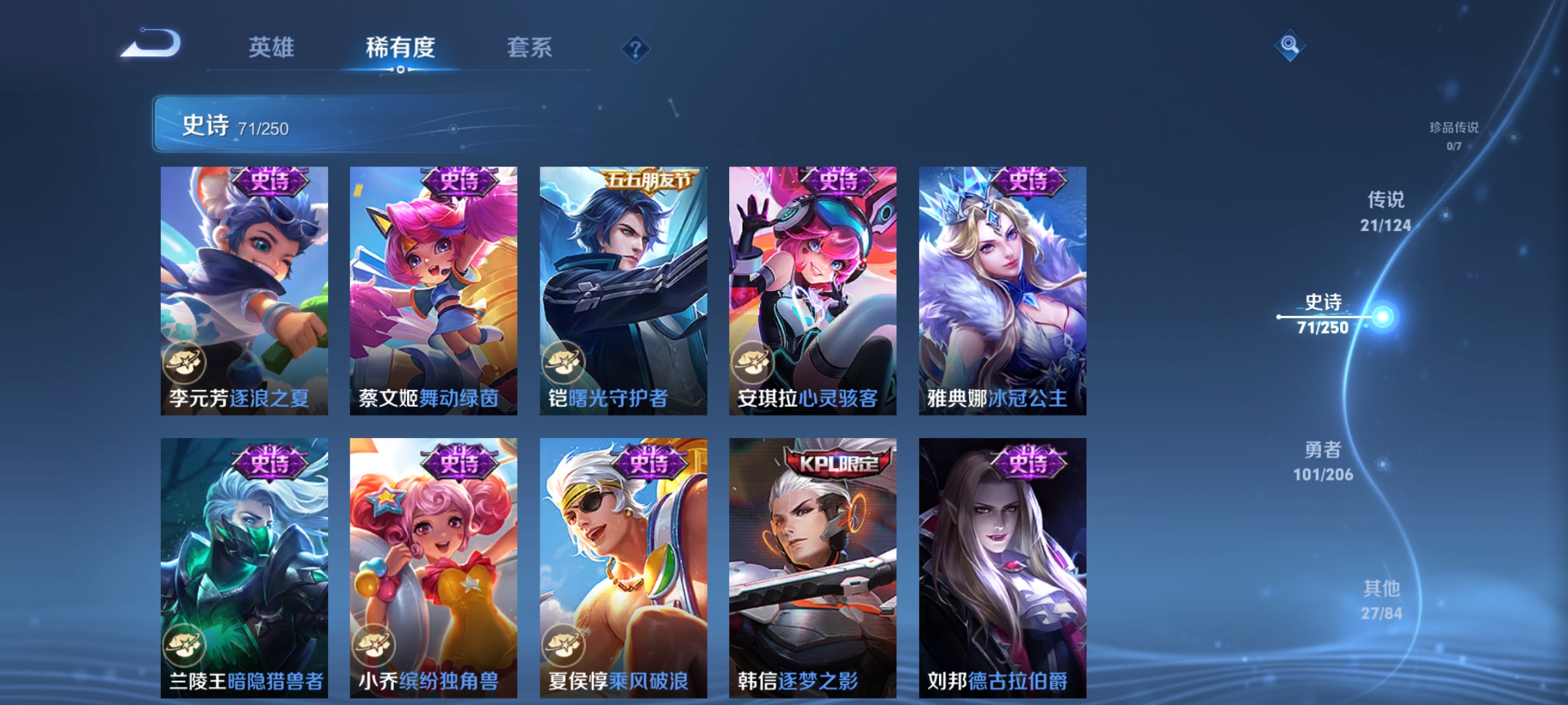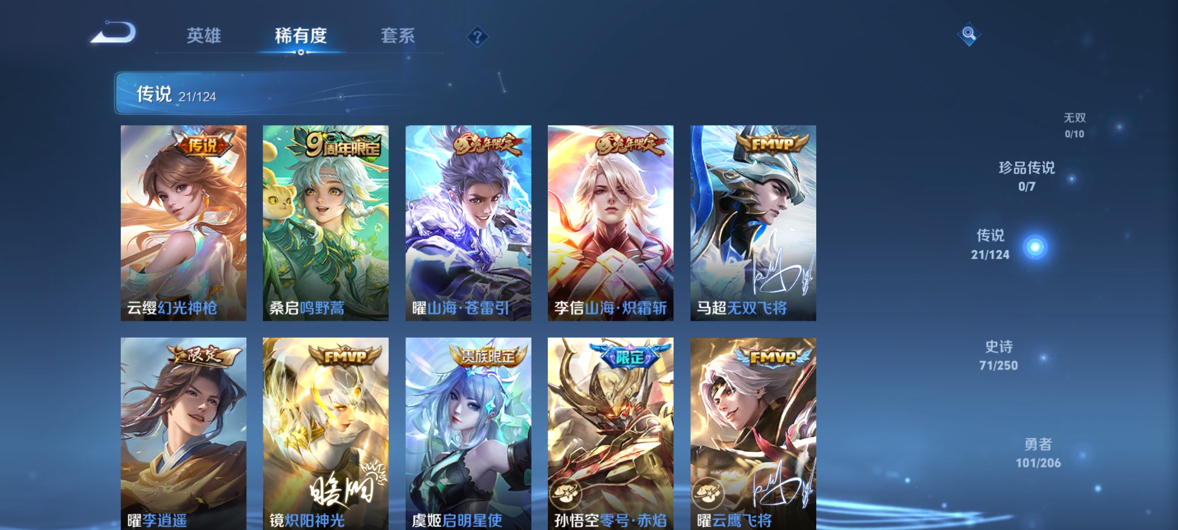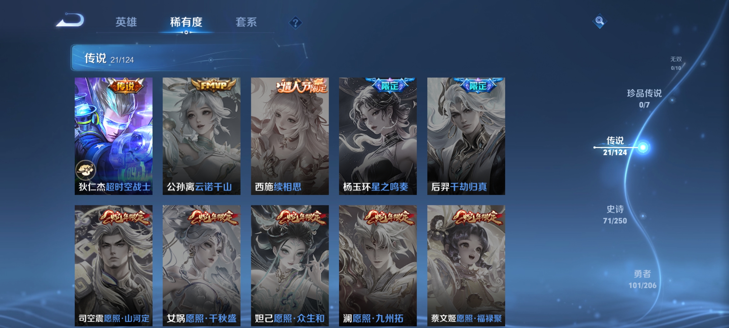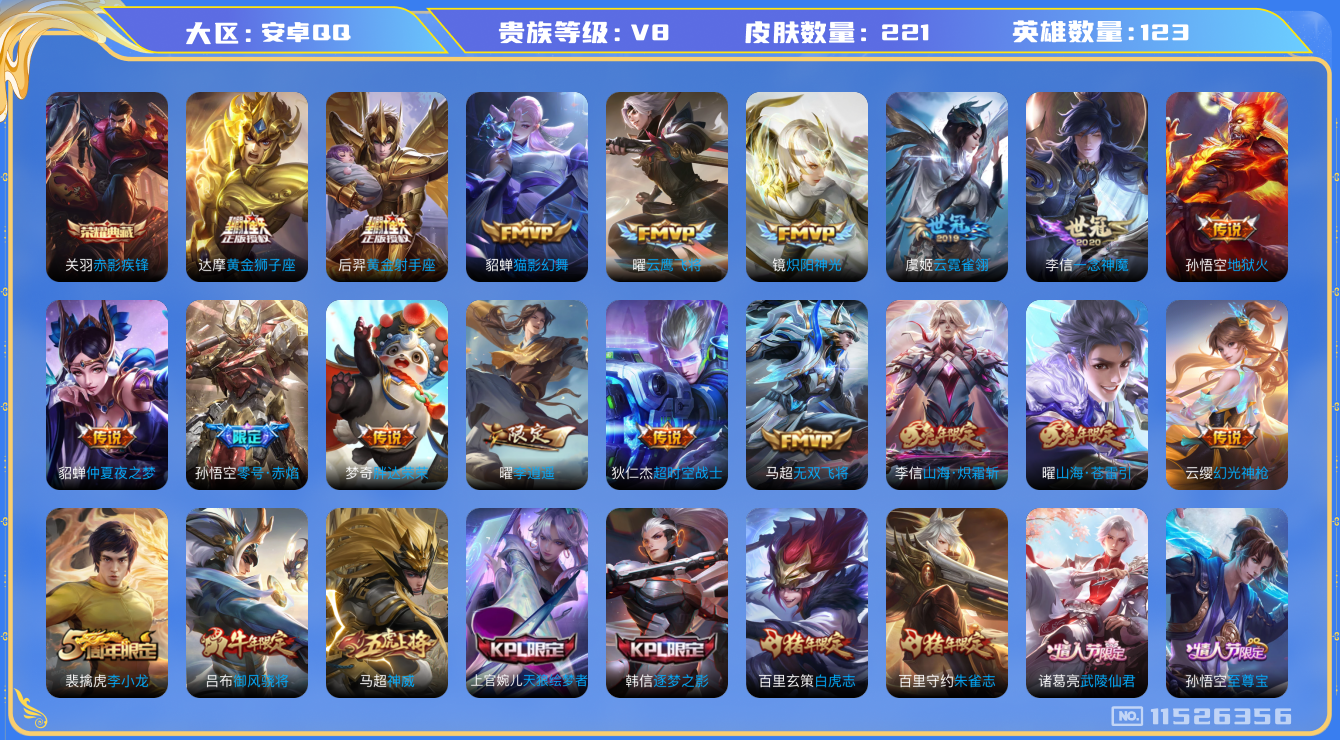 [11526356]关羽典藏,武则天,小将军,李逍遥,电光耗子,仲夏夜,武陵仙君,玉兔公主,白鹤梁神女,紫霞,至尊宝,马可年限,-可二次-123英雄-221皮肤-1典藏-21传说-71史诗 炽阳神光-镜 山海·苍雷引-曜 白虎志-百里玄策 山海·炽霜斩-李信 武陵仙君-诸葛亮 山海·玄木吟-马可波罗 冰冠公主-雅典娜 天狼绘梦者-上官婉儿 神威-马超 至尊宝-孙悟空 街头霸王-韩信