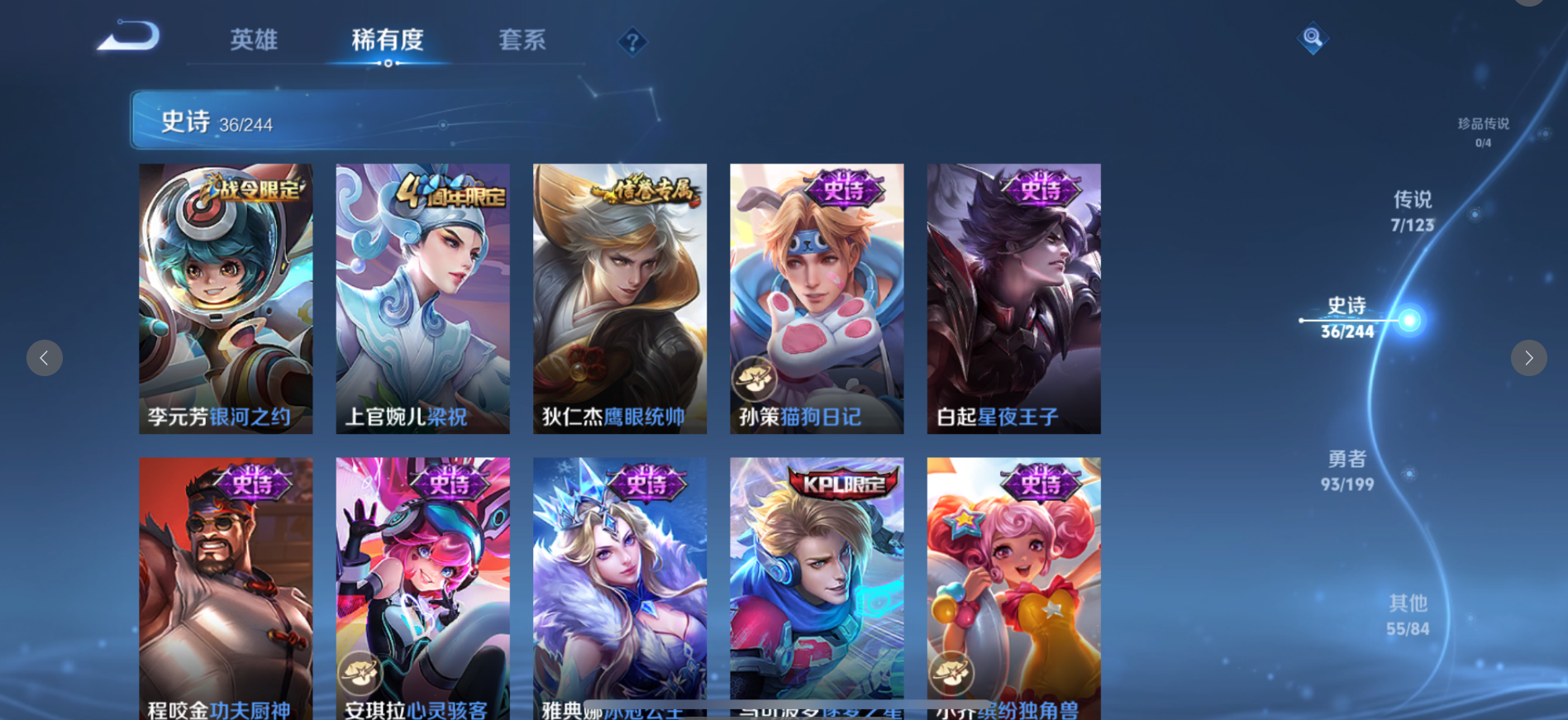 扁鹊炼金王,虞姬凯尔特女王,白起狰,太乙真人饕餮,曹操烛龙,芈月重明,典韦穷奇,狂铁御狮,米莱狄御霄,牛魔御旌,盾山御銮,夏侯惇朔风刀,明世隐疑决卦,老夫子醍醐杖,鬼谷子原初探秘者,程咬金演武夺筹,钟馗驱傩正仪,苏烈千军破阵,沈梦溪星空之诺,李元芳银河之约,刘邦夺宝奇兵,弈星混沌棋,达摩沙漠行僧,兰陵王金庭之子,沈梦溪大漠名商,李元芳云中旅人,桑启海盐诗旅,裴擒虎擒涛扼浪,鲁班大师探海日志,张良古海寻踪,项羽苍威无极,镜青焰无极