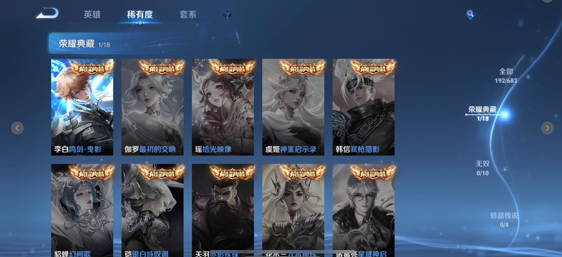 - PX_2094444-17 苹果QQ/至圣王者/247皮肤/123英雄/1典藏/0珍品无双/0无双/0珍品传说/16传说/69史诗/7稀有英雄 【1 典藏皮肤】鸣剑·曳影 李白, 【16 传说皮肤】武圣 关羽,启明星使 虞姬,白虎志 百里玄策,李逍遥 曜,云鹰飞将 曜,凤求凰 李白,祈雪灵祝 公孙离,时雨天司 诸葛亮,炽阳神光 镜,寅虎·瑞焰 鲁班七号,久胜战神 干将莫邪,一念神魔 李信,淬星耀