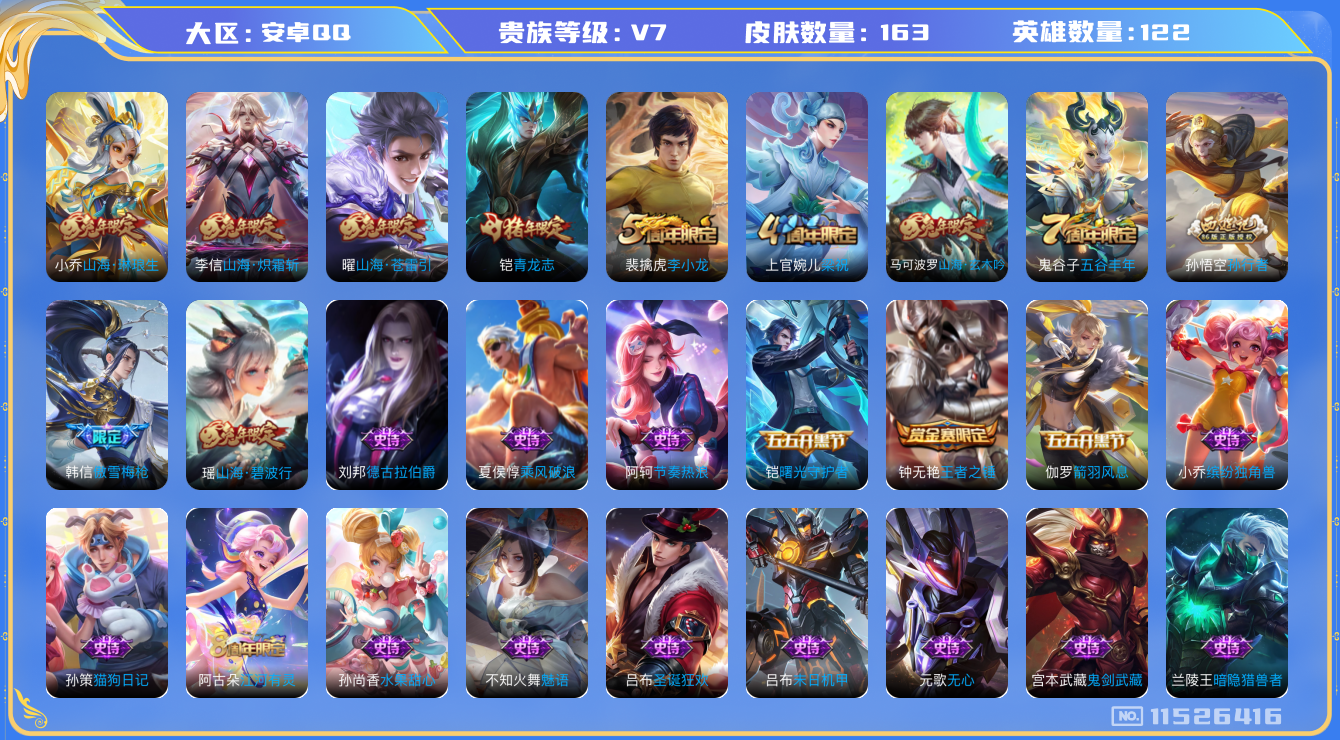 - [12022912]V7 1珍品传说 13传说 125英雄 191皮肤 可修改实名 优质装备:怪盗基德,炽阳神光,一念神魔,末日机甲-孙策,挚爱之约,琥珀纪元铠,琥珀纪元马超,涂山容容 传说皮:乘龙·问璇玑(孙尚香年限),乘龙·铭钟鼎(赵云年限),乘龙·淬吴钩(孙策年限),典韦战鼓燎原 珍宝阁皮:妄想食味,玩趣恶龙 限定皮:愿照·九州拓(澜年限),愿照·山河定(司空震年限),鸣野蒿,五谷丰年,李小龙 史诗皮:鸭鸭历险记-刘禅,器灵·浮梦炉,星界战将,龙之律动,石田雨龙,百相守梦-周瑜,茶境仙,琥珀纪元伽罗,乘龙·聚宝船(安琪拉年限),乘龙·忆丹青(大乔年限),百相守梦-黄忠,紫霞仙子,特工魅影,千年之狐,永昼,浮梦罗烟,百解令(蒙犽),高渐离燃音魔法,蒙恬荣光圣徽,偶像歌手,猫狗日记-孙策,乱世虎臣,节奏热浪,女仆咖啡,水果甜心,天才门将,星夜王子,暗隐猎兽者,幽灵船长,鬼剑武藏,暗渊魔法,天秀·启明,纤云弄巧,拒霜思,乘风破浪,逐浪之夏,水晶猎龙者,曙光守护者,金属风暴,原初追逐者,圣诞狂欢,鹰眼统帅,赏金猎手,天秀·音浪,未来纪元-赵云