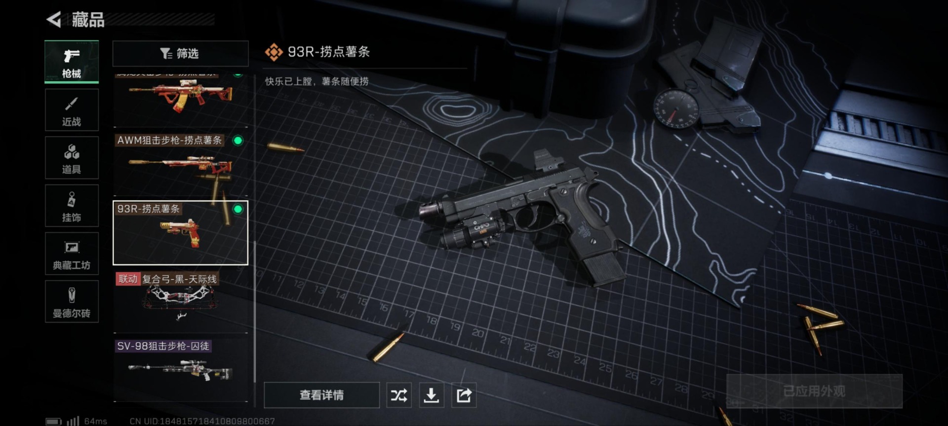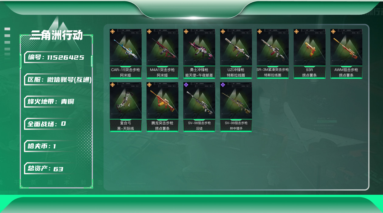 [11526425]总资产:63M 9传说枪械 哈夫币:1.084K 可二次 可修改实名 安全保护中 优质装备:顶级安全箱(3x3) 烽火地带段位:青铜 全面战场段位:无段位 传说武器皮肤:93R-捞点薯条,AWM狙击步枪-捞点薯条,腾龙突击步枪-捞点薯条,CAR-15突击步枪-阿米娅,SR-3M紧凑突击步枪-特斯拉线圈,UZI冲锋枪-特斯拉线圈,勇士冲锋枪-能天使-午夜邮差,复合弓-黑-天际线,M4A1突击步枪-阿米娅 史诗武器皮肤:SV-98狙击步枪-林中猎手,SV-98狙击步枪-囚徒