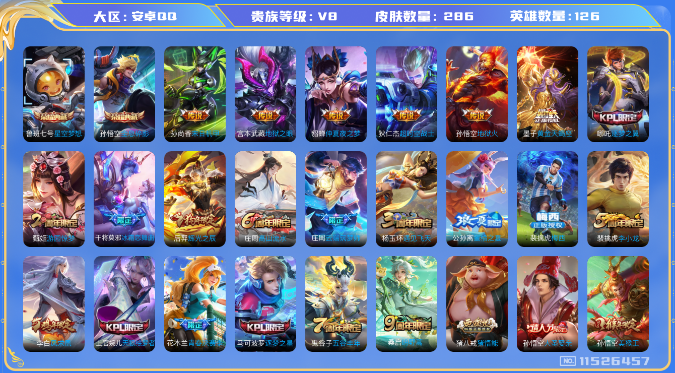[11526457]V8 2典藏 9传说 126英雄 286皮肤 典藏英雄武则天 可修改实名 优质装备:星空梦想(太空人),全息碎影(猴子典藏),末日机甲-孙尚香(绿蚂蚱),地狱火,仲夏夜之梦(大飞蛾),地狱之眼,超时空战士-狄仁杰,黄金天蝎座 珍宝阁皮:优雅恋人,玩趣恶龙 限定皮:鸣野蒿,凤求凰(白切鸡),梅西,遇见飞天,高山流水,五谷丰年,冰锋战神,游园惊梦,逐梦之翼,逐梦之星,天狼绘梦者,李小龙,逐梦之影,辉光之辰,猪悟能,大圣娶亲,青春决赛季,冰霜恋舞曲,云端筑梦师,蜜橘之夏,神奇女侠,美猴王 史诗皮:涂山红红,乘龙·聚宝船(安琪拉年限),紫霞仙子,白龙吟,黄金分割率,特工魅影,千年之狐,魅语,冰冠公主,偶像歌手,龙骑士(小龙虾),末日机甲-吕布,猫狗日记-孙策,乱世虎臣,节奏热浪,女仆咖啡,摇滚巨星,水果甜心,绅士熊喵,天才门将,心灵骇客,功夫厨神,德古拉伯爵,暗隐猎兽者,幽灵船长,鬼剑武藏,地狱岩魂,缤纷独角兽,乘风破浪,逐浪之夏,水晶猎龙者,金属风暴,原初追逐者,圣诞狂欢,圣诞恋歌,鹰眼统帅,王者之锤,魅力维加斯,黎明之约,无心,未来纪元-赵云
