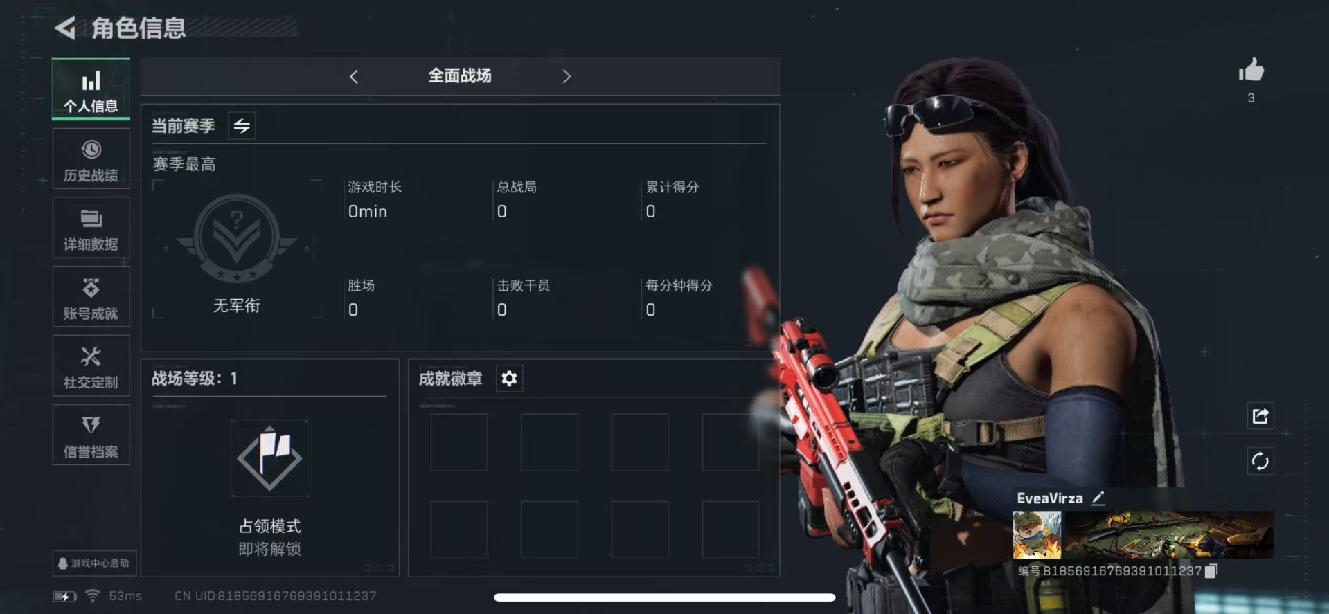 [11526481]总资产:70.2M 1传说枪械 哈夫币:54.431K 可二次 可修改实名 烽火地带段位:钻石 全面战场段位:无段位 传说武器皮肤:复合弓-黑-天际线