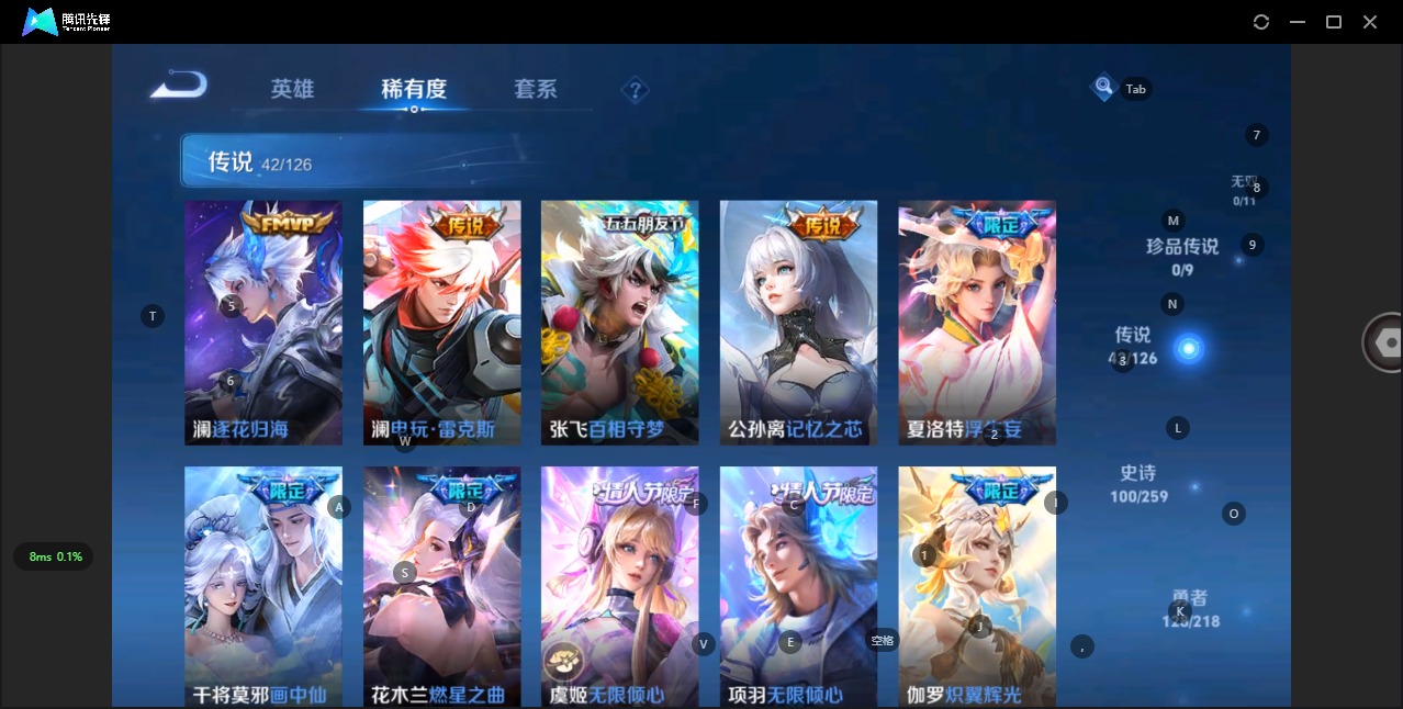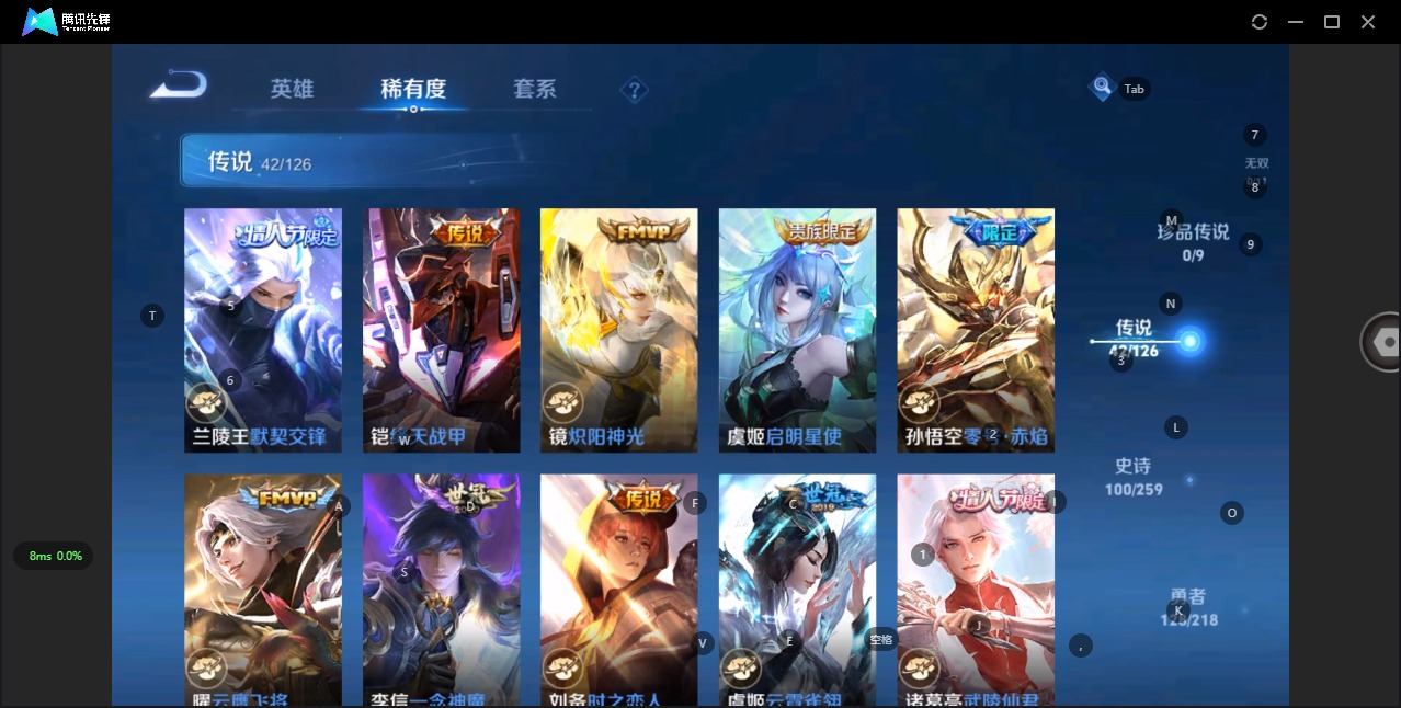 - [11940870]V7 1典藏 6传说 124英雄 194皮肤 可修改实名 优质装备:弑枪猎影(韩信典藏),久胜战神,一念神魔,地狱火,李逍遥,涂山容容 珍宝阁皮:胡桃夹子,女武神 限定皮:鸣野蒿,白鹤梁神女,白晶晶,诗剑行,五谷丰年,冰锋战神,梁祝,李小龙,大圣娶亲 史诗皮:化蝶舞,百相守梦-黄忠,紫霞仙子,白龙吟,黄金分割率,特工魅影,千年之狐,江河有灵,偶像歌手,晚萤,龙骑士(小龙虾),末日机甲-吕布,猫狗日记-孙策,乱世虎臣,修罗,女仆咖啡,水果甜心,星夜王子,功夫厨神,德古拉伯爵,暗隐猎兽者,鬼剑武藏,心灵战警,纤云弄巧,乘风破浪,唤灵魅影,金属风暴,鹰眼统帅,魅力维加斯