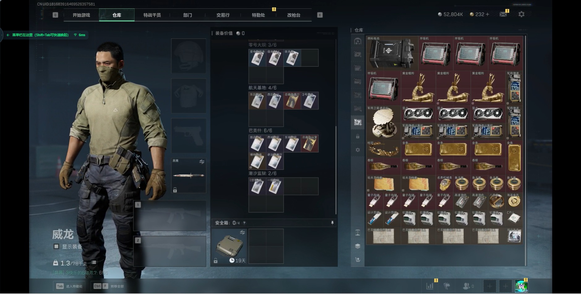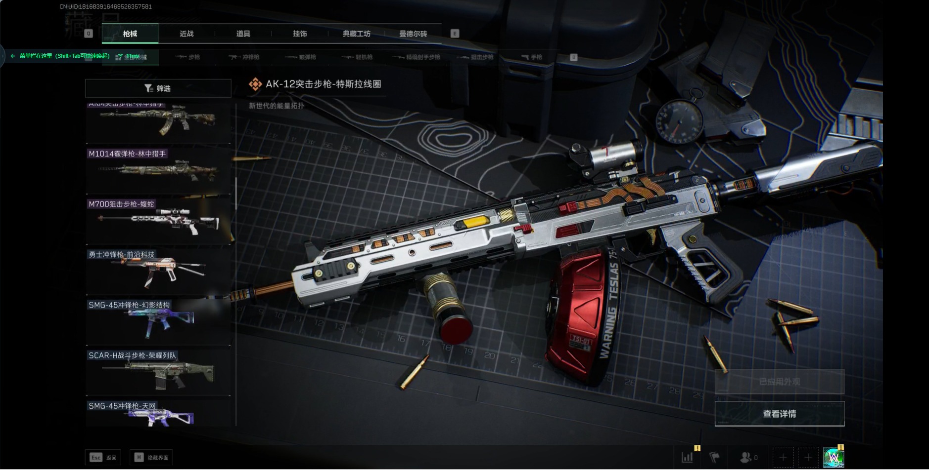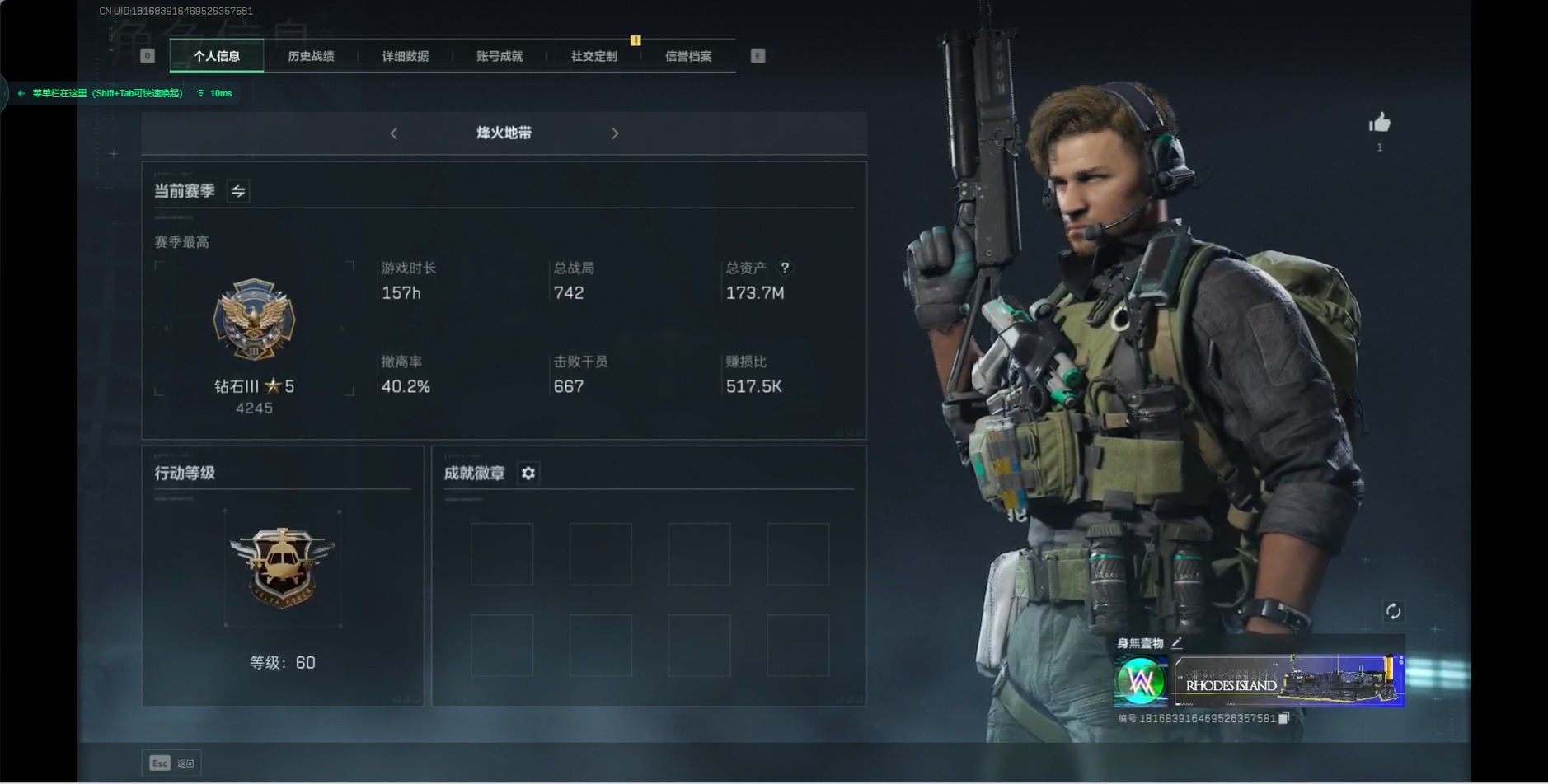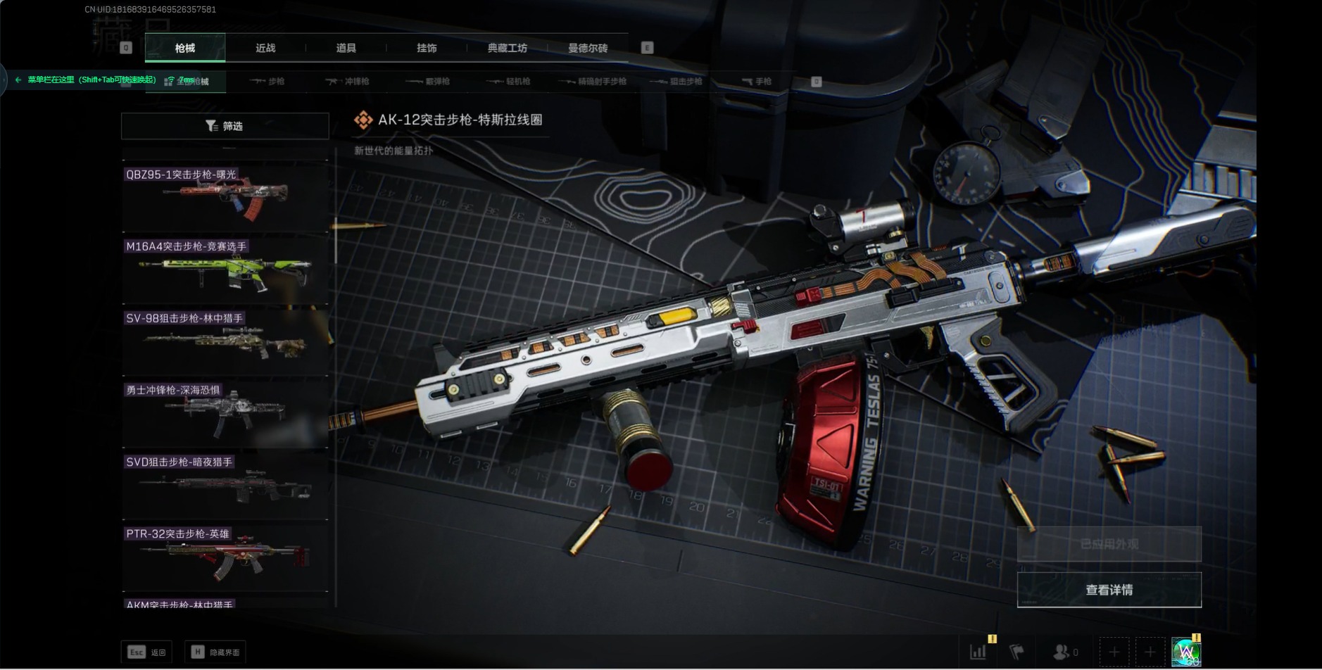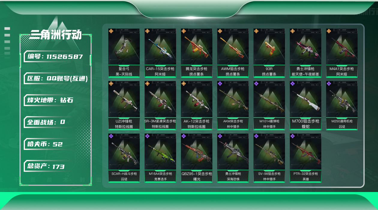 [11526587]总资产:173.7M 10传说枪械 哈夫币:52.804K 进阶安全箱(2×2)9.15号到期 可二次 可修改实名 烽火地带段位:钻石 全面战场段位:无段位 传说武器皮肤:93R-捞点薯条,AWM狙击步枪-捞点薯条,腾龙突击步枪-捞点薯条,AK-12突击步枪-特斯拉线圈,CAR-15突击步枪-阿米娅,SR-3M紧凑突击步枪-特斯拉线圈,UZI冲锋枪-特斯拉线圈,勇士冲锋枪-能天使-午夜邮差,复合弓-黑-天际线,M4A1突击步枪-阿米娅 史诗武器皮肤:M700狙击步枪-蝮蛇,M16A4突击步枪-竞赛选手,勇士冲锋枪-深海恐惧,AKM突击步枪-林中猎手,M1014霰弹枪-林中猎手,SV-98狙击步枪-林中猎手,PTR-32突击步枪-英雄,M250通用机枪-囚徒,SCAR-H战斗步枪-囚徒,QBZ95-1突击步枪-曙光