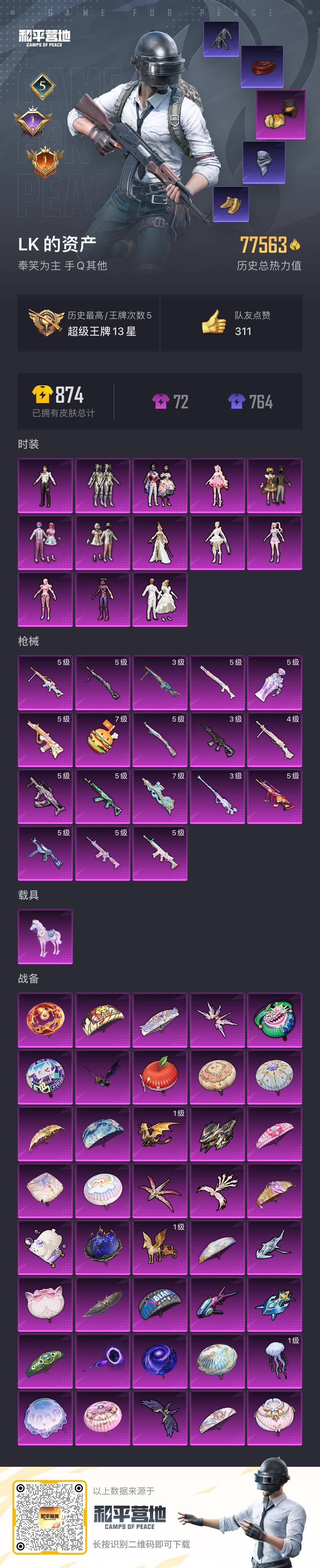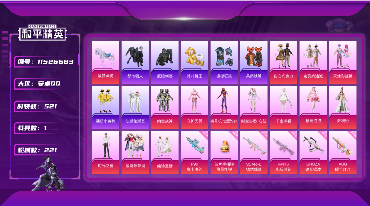 [11526683]13粉装 18特效枪 1载具 5印记 可二次 可修改实名 身法装备:都市猎人,舞王派对(派对舞王、小金鞋),暗影哥特(红眼罩),初号机 觉醒Ver.(新紫螳螂),8号机(新粉螳螂),Mark.06(新蓝螳螂) 优质装备:晶梦灵驹,甜心巧克力,舞王派对(派对舞王、小金鞋),都市猎人,宝贝奶油派,天使彩虹糖,绚金战神,SCAR-L-锦绣绵绵,SPAS-12蜜语绒猫,M416电玩时刻,M416墨龙九天,M200梦海之灵,UMP45量子极限,Famas-初号机 觉醒Ver.,P90-金丰海韵,七级P90-金丰海韵,M762-青锋波束,时空协奏·心弦,DP-28-千金淑猫,千金淑猫,GROZA-镜光银凌,萨利娅,烟雾弹-丁香清露,AUG-暖羊咩咩,破片手榴弹-热量炸弹,七级破片手榴弹-热量炸弹,樱桃泡泡,星穹咏叹调,MG3-辉羽雀灵,时光之誓,Kar98K-巳巳如意 热门装扮:纯珍童话,守护天翼,初号机 觉醒Ver.(新紫螳螂),动感兔斯基,潮萌小黄鸭,迅捷狂鲨,鹰眼刺客,呆萌铁蟹,都市猎人,派对舞王(小金鞋) 稀有枪皮:MG-36-沧焰双生,DP-28-豹影疾电 五级特效枪:五级M762-青锋波束,五级Famas-初号机 觉醒Ver.,五级UMP45-量子极限,五级GROZA-镜光银凌,五级Kar98K-巳巳如意,五级DP-28-豹影疾电,五级MG-36-沧焰双生,五级烟雾弹-丁香清露,五级AUG-暖羊咩咩,五级M416-电玩时刻,五级SPAS-12-蜜语绒猫,五级SCAR-L-锦绣绵绵 四级特效枪:四级DP-28-千金淑猫 三级特效枪:三级M416-墨龙九天,三级M200-梦海之灵,三级MG3-辉羽雀灵 紫色装扮:SS31特训套装,虚空漩涡,霓虹热舞,极速光影,SS30特训套装,云朵鹅,彩虹兔,雪绒豹,乐游熊熊,SS33特训套装,顶瓜瓜,诡诞巡游,混沌火种,粉团憨憨,缤纷果语,魅力单车,黄色运动,黑色伏地魔,龟仙人,冰河战士,龙魂突击队,蝶变,香桃花海,银刃勇者大衣,熔岩游骑兵连帽夹克,极地朋克,沙漠兵团,海岛探路者,夏日倾情,空岛之星,王牌教练,灼焰舞者,热血青春,燃烧卡路里,狂战萌兔,粉日山川,小熊娃娃,雏菊兔兔,萝兰蝴蝶,SS29特训,湖畔霞光,星途旅人,纯真浪花,热情海星,曼妙人鱼,SS28特训,卖崽青蛙,创世·追猎,奶油梦幻熊,粉雾星云,极地流光,暗影刺翼,