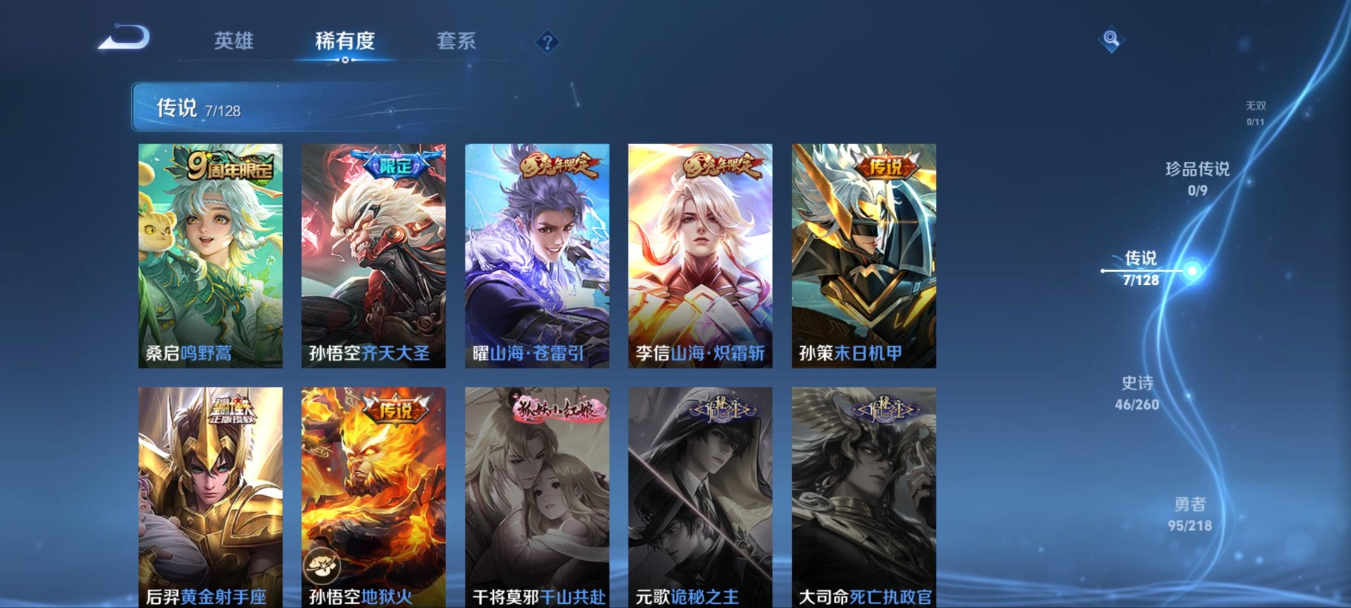 - [11680428]V7 1典藏 6传说 124英雄 285皮肤 可修改实名 优质装备:鸣剑·曳影,冠军飞将,炽阳神光,一念神魔,地狱火,淬星耀世,超时空战士-狄仁杰 珍宝阁皮:蔷薇恋人,玩趣恶龙 限定皮:神威(电光马子),遇见飞天,高山流水,五谷丰年,冰锋战神,梁祝,逐梦之星,李小龙,逐梦之影,朱雀志(守约年限),孙行者 史诗皮:星界战将,苍穹之光,电玩小子(小书包),白龙吟,黄金分割率,千年之狐,江河有灵,蒙恬荣光圣徽,偶像歌手,魅语,电玩·爆裂旋风,暗夜猫娘,乱世虎臣,修罗,摇滚巨星,水果甜心,绅士熊喵,天才门将,星夜王子,心灵骇客,时之奇旅-安琪拉,德古拉伯爵,暗隐猎兽者,幽灵船长,鬼剑武藏,暗渊魔法,心灵战警,舞动绿茵,地狱岩魂,纤云弄巧,拒霜思,缤纷独角兽,乘风破浪,逐浪之夏,水晶猎龙者,曙光守护者,金属风暴,原初追逐者,圣诞狂欢,圣诞恋歌,鹰眼统帅,魅力维加斯,黎明之约,无心,未来纪元-赵云