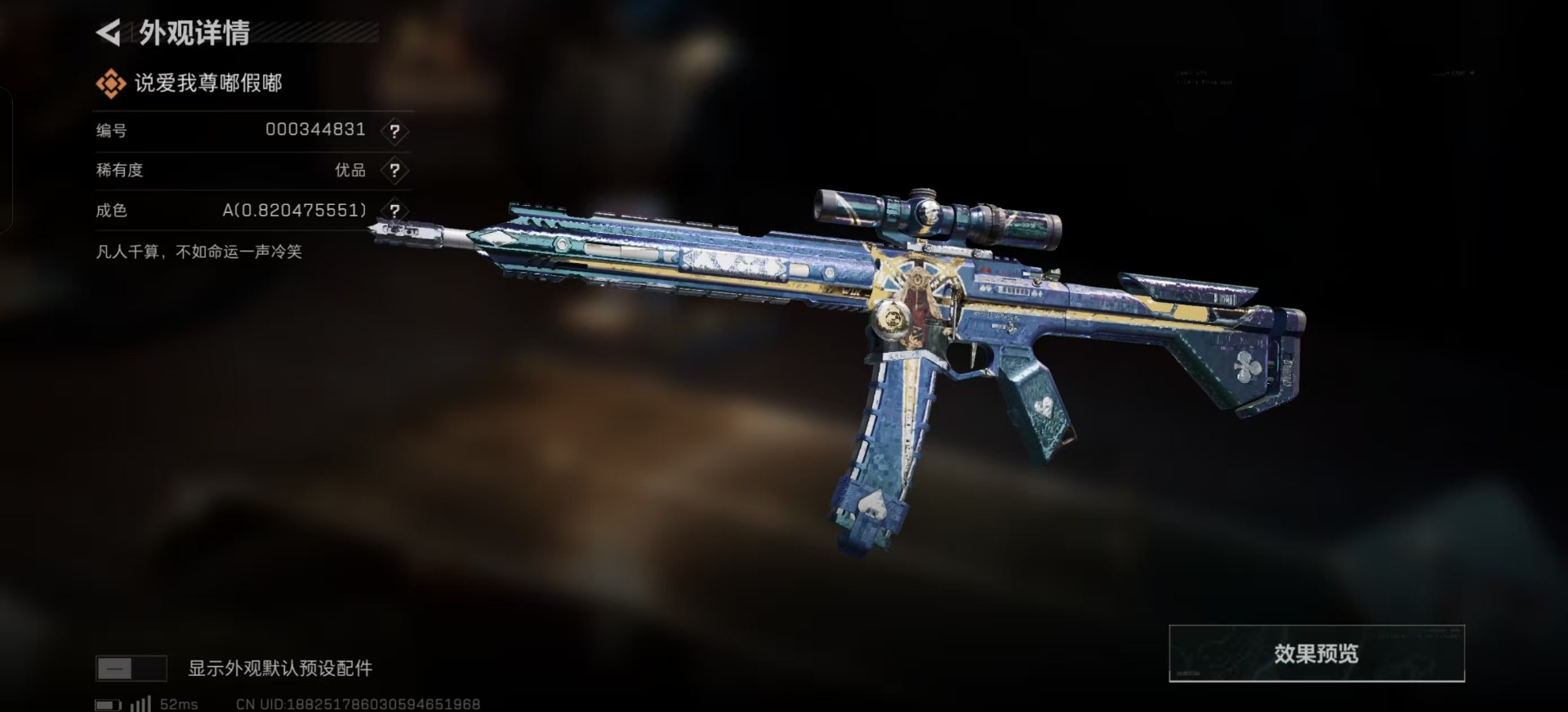 [11526739]总资产:49.6M 5干员外观 2近战传说 26传说枪械 哈夫币:3.732K 高级安全箱(9.17到期) 可二次 可修改实名 优质装备:近战-影锋,近战-北极星,K416突击步枪-命运(典藏),QBZ95-1突击步枪-王牌之剑(典藏) 烽火地带段位:钻石 全面战场段位:上等兵 传说武器皮肤:QJB201轻机枪-风林火山,SR-25射手步枪-水墨云图,SCAR-H战斗步枪-水墨云图,M1014霰弹枪-影锋,AWM狙击步枪-影锋,SCAR-H战斗步枪-铁艺苍穹,AK-12突击步枪-夜鹰,G18-飞虎,M16A4突击步枪-狩猎时刻,M4A1突击步枪-阿米娅,CAR-15突击步枪-阿米娅,复合弓-黑-天际线,Vector冲锋枪-狩猎时刻,G3战斗步枪-狩猎时刻,QCQ171冲锋枪-北极星,勇士冲锋枪-能天使-午夜邮差,725双管霰弹枪-送葬人-无题密令,K437突击步枪-北极星,M4A1突击步枪-蚀金玫瑰,QBZ95-1突击步枪-破军,CAR-15突击步枪-黑鹰坠落,Vector冲锋枪-能天使-午夜邮差 史诗武器皮肤:K416突击步枪-暗鸦,SR-3M紧凑突击步枪-英雄,QBZ95-1突击步枪-ACE,M4A1突击步枪-特勤执行,AUG突击步枪-特勤执行,Vector冲锋枪-红色彗星,PTR-32战斗步枪-ACE,PKM通用机枪-蝮蛇,G3战斗步枪-战场英杰,M16A4突击步枪-竞赛选手,AS Val突击步枪-尖端治疗,SG552突击步枪-尖端治疗,PKM通用机枪-荒野求生,MP5冲锋枪-深海恐惧,勇士冲锋枪-深海恐惧,SG552突击步枪-深海恐惧,AKM突击步枪-林中猎手,M1014霰弹枪-林中猎手,PTR-32突击步枪-英雄,AS Val突击步枪-典狱官,M250通用机枪-囚徒,SCAR-H战斗步枪-囚徒,MP7冲锋枪-无垢,QBZ95-1突击步枪-曙光,SCAR-H战斗步枪-国风,S12K霰弹枪-曙光,PKM通用机枪-英雄,PKM通用机枪-魔药,AUG突击步枪-战术迷彩 干员外观:威龙-铁面判官,红狼-蚀金玫瑰,骇爪-水墨云图,威龙-飞虎,露娜-黑·天际线