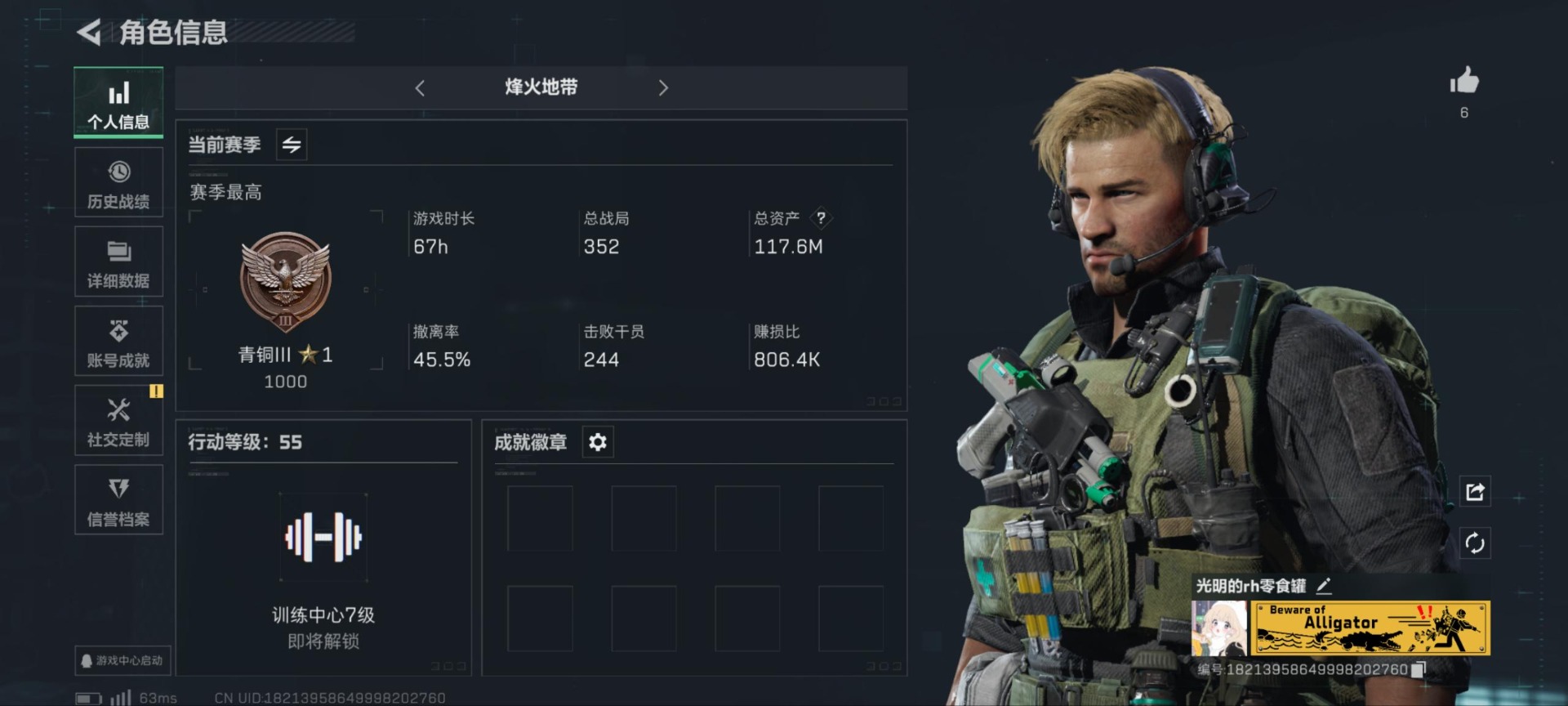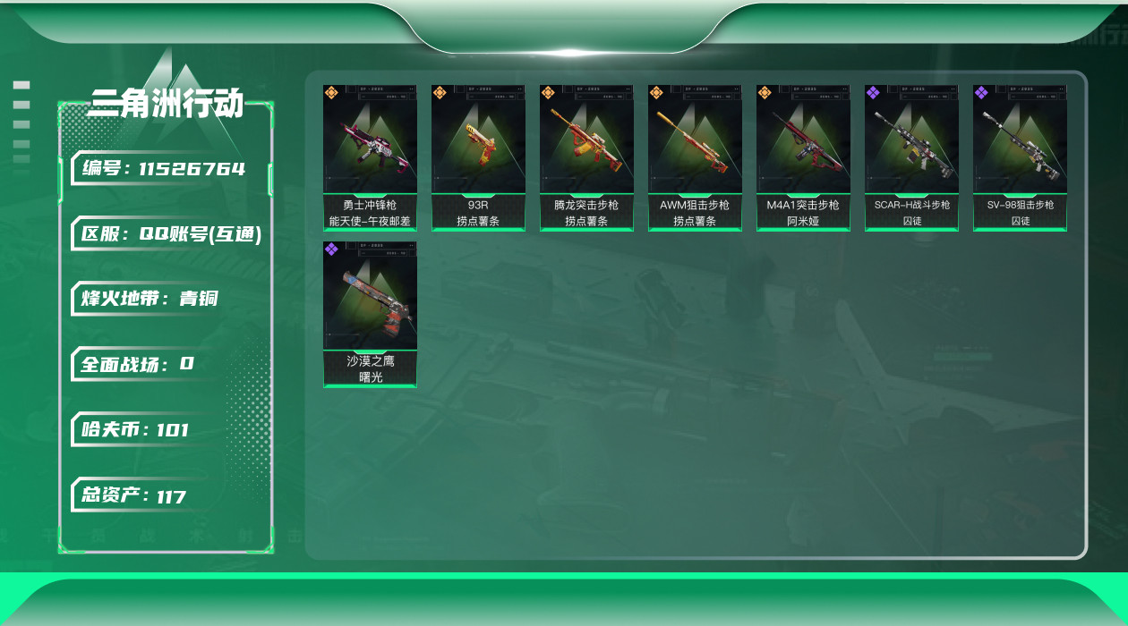 [11526764]总资产:117.6M 5传说枪械 哈夫币:101K 进阶安全箱(9.17到期) 可二次 可修改实名 烽火地带段位:青铜 全面战场段位:无段位 传说武器皮肤:M4A1突击步枪-阿米娅,AWM狙击步枪-捞点薯条,腾龙突击步枪-捞点薯条,93R-捞点薯条,勇士冲锋枪-能天使-午夜邮差 史诗武器皮肤:SV-98狙击步枪-囚徒,SCAR-H战斗步枪-囚徒,沙漠之鹰-曙光