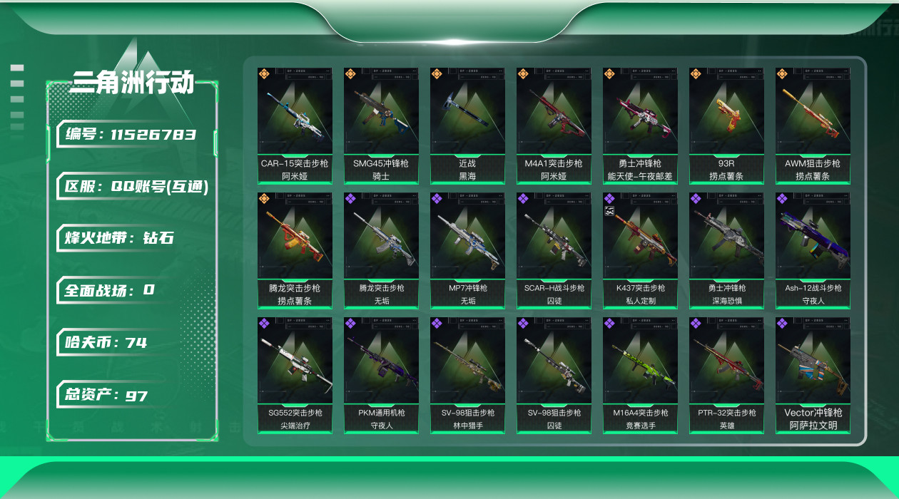 [11526783]总资产:97M 6干员外观 1近战传说 8传说枪械 哈夫币:74.212K 高级安全箱(9.17到期) 可二次 可修改实名 优质装备:近战-黑海 烽火地带段位:钻石 全面战场段位:军士长 传说武器皮肤:SMG45冲锋枪-骑士,M4A1突击步枪-阿米娅,CAR-15突击步枪-阿米娅,AWM狙击步枪-捞点薯条,腾龙突击步枪-捞点薯条,93R-捞点薯条,勇士冲锋枪-能天使-午夜邮差 史诗武器皮肤:K437突击步枪-私人定制(典藏),Ash-12战斗步枪-守夜人,M16A4突击步枪-竞赛选手,PKM通用机枪-守夜人,SG552突击步枪-尖端治疗,PKM通用机枪-荒野求生,勇士冲锋枪-深海恐惧,SR-3M紧凑突击步枪-荒野求生,SV-98狙击步枪-林中猎手,PTR-32突击步枪-英雄,SVD狙击步枪-荒野求生,SV-98狙击步枪-囚徒,SCAR-H战斗步枪-囚徒,腾龙突击步枪-无垢,MP7冲锋枪-无垢,PSG-1射手步枪-无垢,沙漠之鹰-曙光,Vector冲锋枪-阿萨拉文明 干员外观:红狼-蚀金玫瑰,骇爪-水墨云图,无名-夜鹰,威龙-飞虎,蜂医-送葬人·无题密令(S5),露娜-黑·天际线