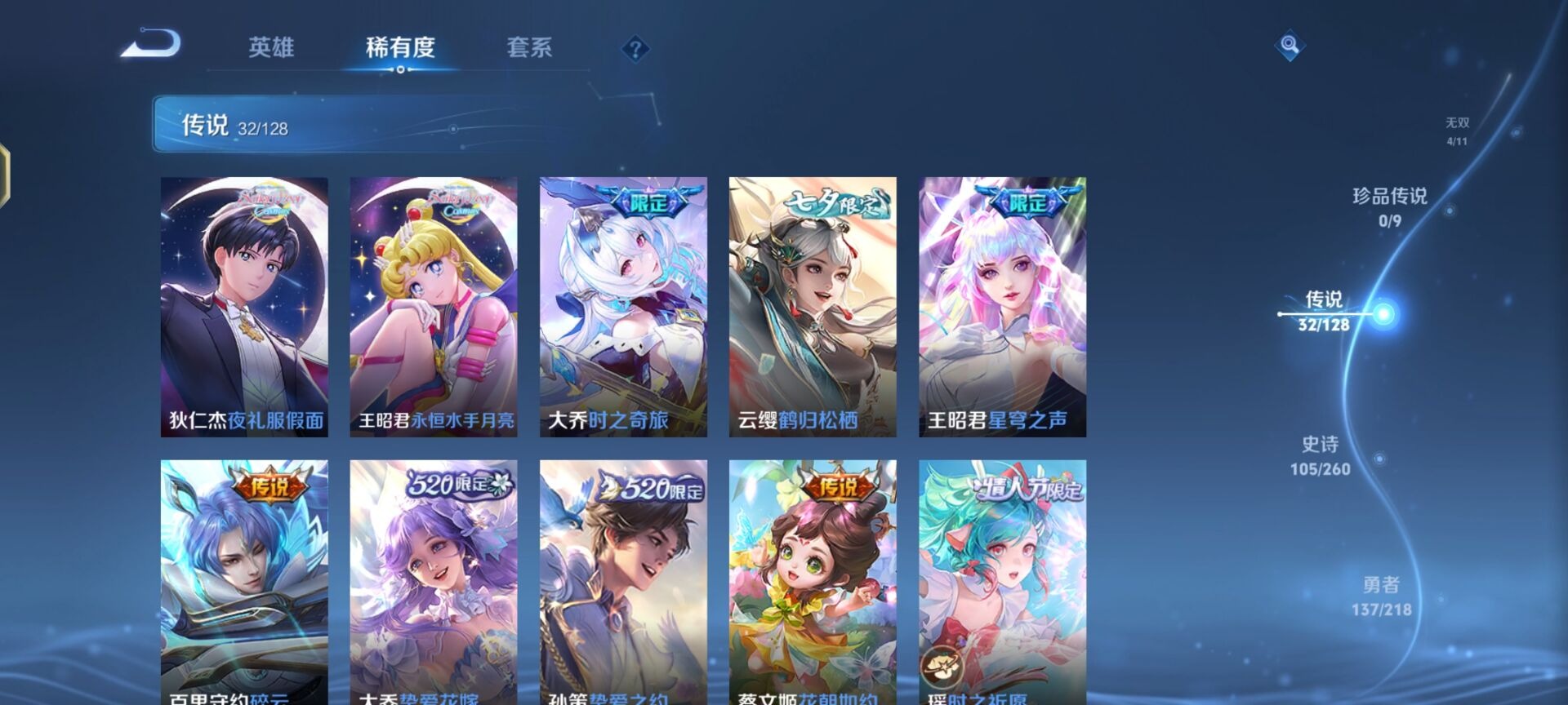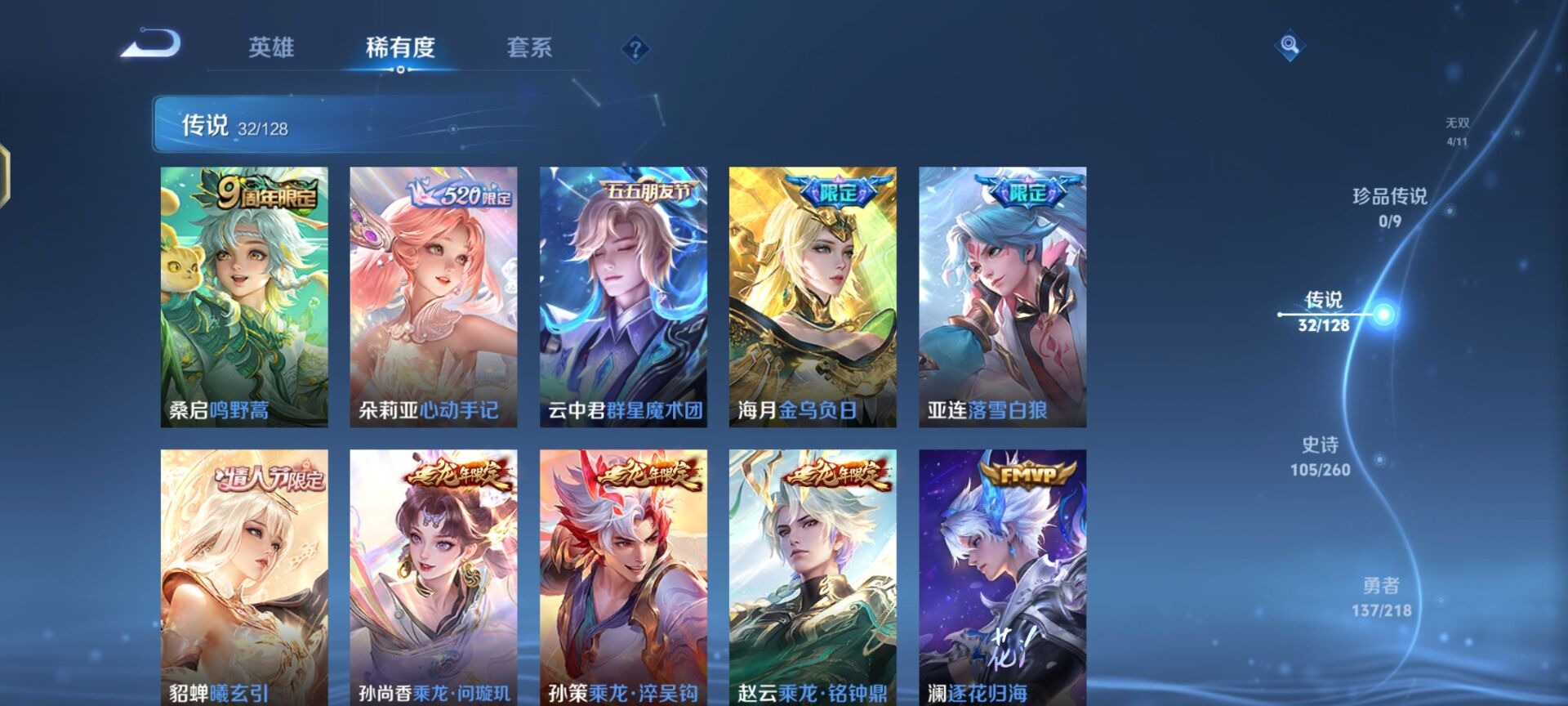 - [11911233]猴子典藏,久胜,紫霞,-可二次-108英雄-165皮肤-1典藏-7传说-31史诗 辉光之辰-后羿 街头霸王-韩信