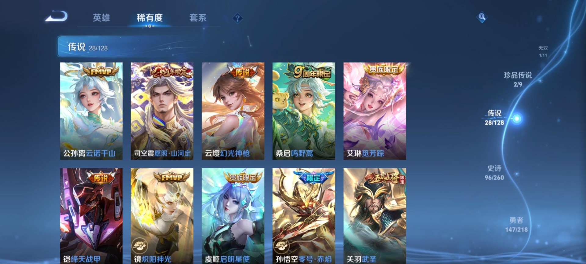 黄忠烈魂,甄姬幽恒,曹操天狼征服者,伽罗太华,张飞虎魄,赵云龙胆,典韦岱宗,后羿如梦令,庄周玄嵩,司空震愿照·山河定,裴擒虎李小龙,裴擒虎天狼狩猎者,上官婉儿梁祝,安琪拉魔法小厨娘,桑启鸣野蒿,孙悟空孙行者,百里玄策白虎志,马超神威,雅典娜神奇女侠,妲己时之彼端,韩信飞衡,嫦娥如梦令,关羽武圣