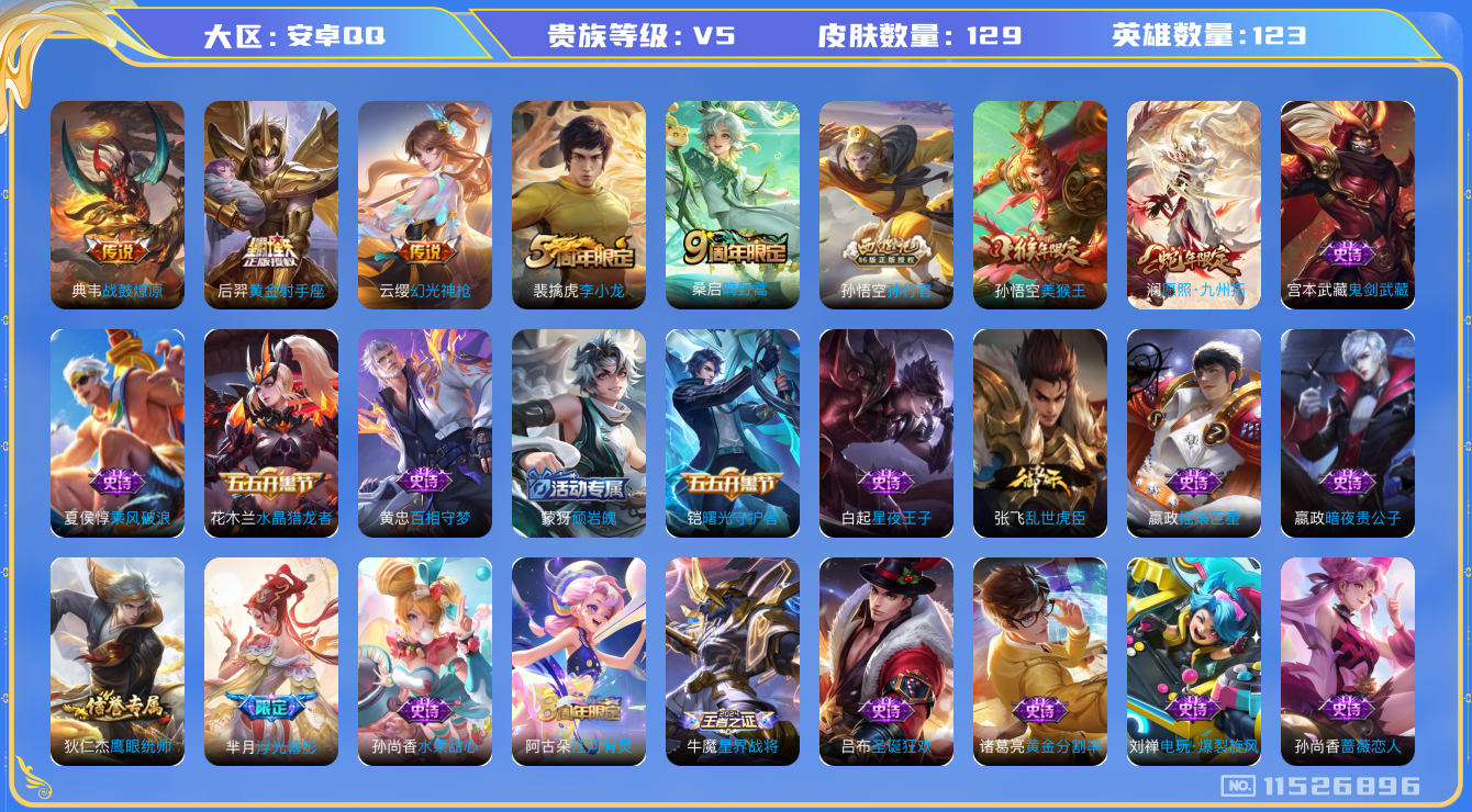 [11526896]V5 5传说 123英雄 129皮肤 可修改实名 优质装备:黄金射手座 传说皮:典韦战鼓燎原,幻光神枪 珍宝阁皮:蔷薇恋人 限定皮:愿照·九州拓(澜年限),鸣野蒿,李小龙,孙行者,美猴王 史诗皮:星界战将,蒙犽顽岩魄,芈月浮光幕影,百相守梦-黄忠,黄金分割率,江河有灵,电玩·爆裂旋风,乱世虎臣,摇滚巨星,水果甜心,星夜王子,鬼剑武藏,乘风破浪,水晶猎龙者,曙光守护者,圣诞狂欢,鹰眼统帅,暗夜贵公子