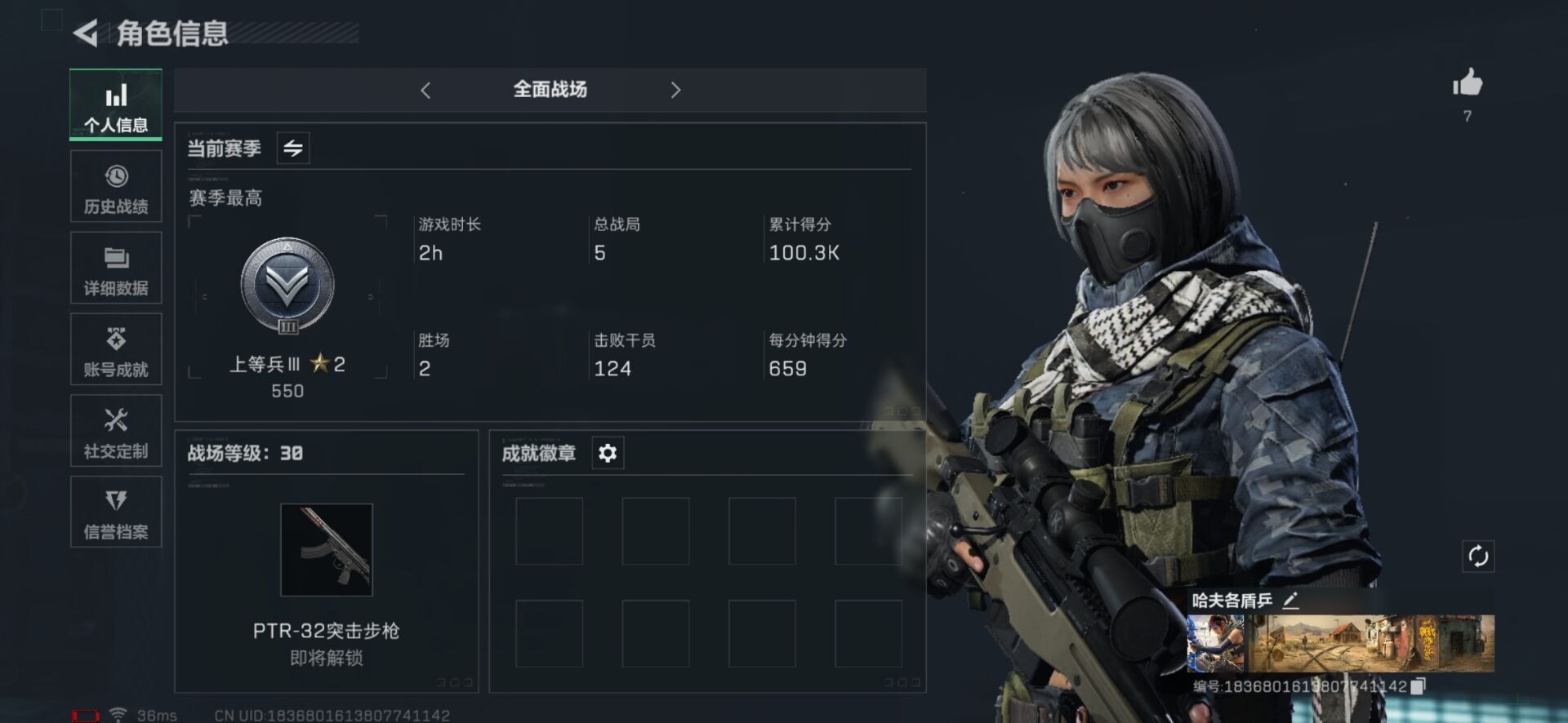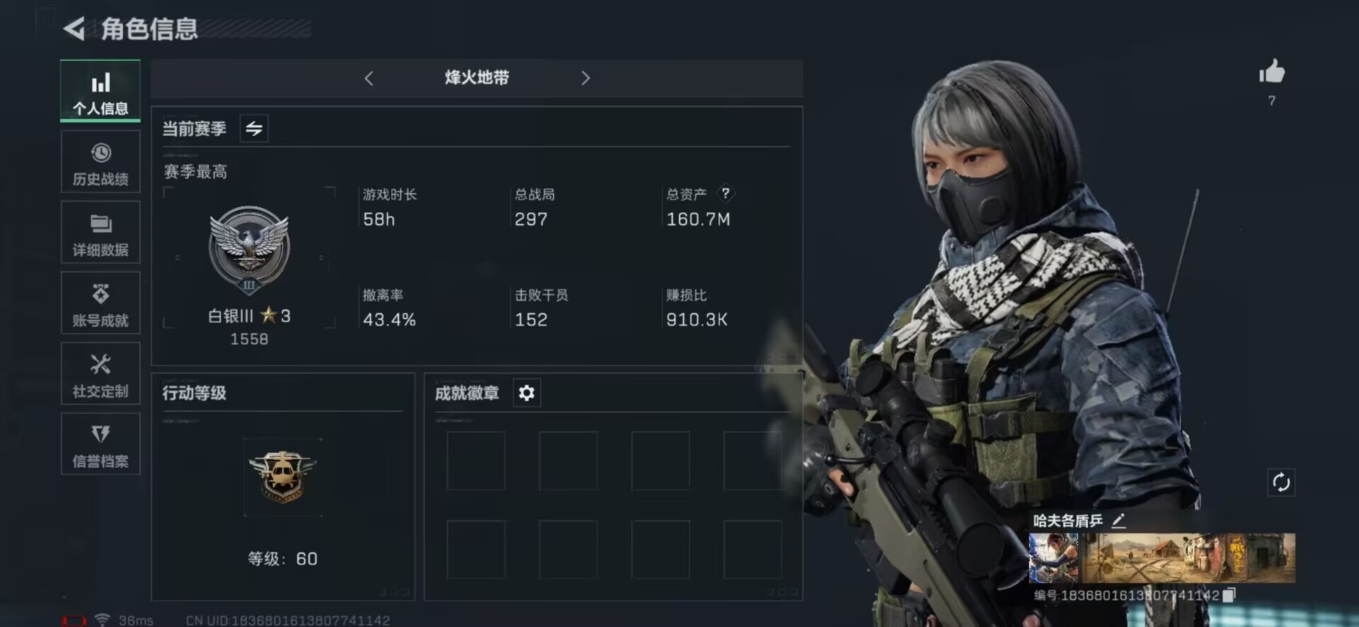 [11526949]总资产:160.7M 6传说枪械 哈夫币:73.794K 可二次 可修改实名 烽火地带段位:白银 全面战场段位:上等兵 传说武器皮肤:AK-12突击步枪-特斯拉线圈,SR-3M紧凑突击步枪-特斯拉线圈,UZI冲锋枪-特斯拉线圈,勇士冲锋枪-能天使-午夜邮差,K416突击步枪-白鹰军团,Vector冲锋枪-能天使-午夜邮差 史诗武器皮肤:SG552突击步枪-深海恐惧,AKM突击步枪-林中猎手,M1014霰弹枪-林中猎手,SV-98狙击步枪-林中猎手,SV-98狙击步枪-囚徒,SCAR-H战斗步枪-囚徒,QBZ95-1突击步枪-曙光,SVD狙击步枪-阿萨拉工艺