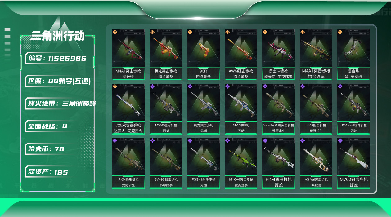 [11526986]总资产:185M 8传说枪械 哈夫币:78.774K 高级安全箱(2×3)9.15号到期 可二次 可修改实名 烽火地带段位:三角洲巅峰 全面战场段位:无段位 传说武器皮肤:M4A1突击步枪-阿米娅,复合弓-黑-天际线,AWM狙击步枪-捞点薯条,腾龙突击步枪-捞点薯条,93R-捞点薯条,勇士冲锋枪-能天使-午夜邮差,725双管霰弹枪-送葬人-无题密令,M4A1突击步枪-蚀金玫瑰 史诗武器皮肤:M700狙击步枪-蝮蛇,PKM通用机枪-蝮蛇,M16A4突击步枪-竞赛选手,PKM通用机枪-荒野求生,SR-3M紧凑突击步枪-荒野求生,SV-98狙击步枪-林中猎手,SVD狙击步枪-荒野求生,AS Val突击步枪-典狱官,M250通用机枪-囚徒,SCAR-H战斗步枪-囚徒,腾龙突击步枪-无垢,MP7冲锋枪-无垢,PSG-1射手步枪-无垢