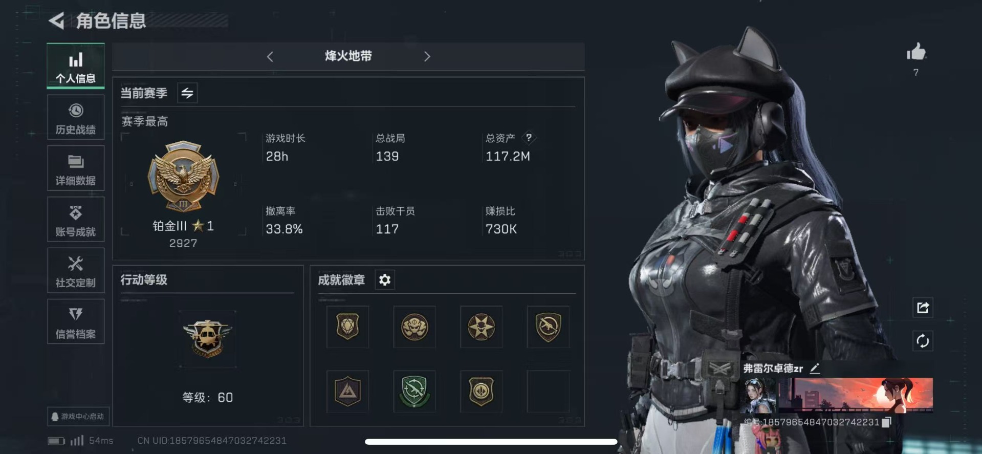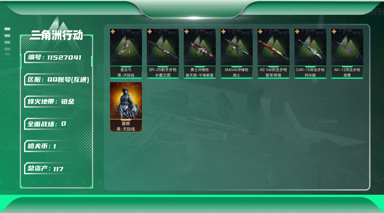 [11527041]总资产:117.2M 1干员外观 7传说枪械 哈夫币:1.725K 进阶安全箱(2×2)9.15号到期 可二次 可修改实名 烽火地带段位:铂金 全面战场段位:上等兵 传说武器皮肤:AS Val突击步枪-蛇年祥瑞,SR-25射手步枪-水墨云图,AK-12突击步枪-夜鹰,SMG45冲锋枪-骑士,CAR-15突击步枪-阿米娅,复合弓-黑-天际线,勇士冲锋枪-能天使-午夜邮差 干员外观:露娜-黑·天际线