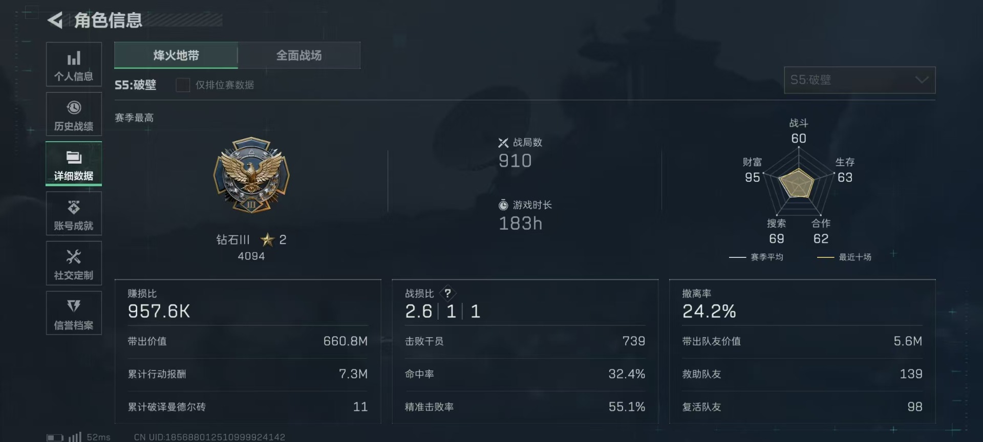 [11527054]总资产:146.9M 10传说枪械 哈夫币:33.522K 可二次 可修改实名 烽火地带段位:钻石 全面战场段位:军士长 传说武器皮肤:93R-捞点薯条,AWM狙击步枪-捞点薯条,腾龙突击步枪-捞点薯条,AK-12突击步枪-特斯拉线圈,CAR-15突击步枪-阿米娅,SR-3M紧凑突击步枪-特斯拉线圈,UZI冲锋枪-特斯拉线圈,勇士冲锋枪-能天使-午夜邮差,复合弓-黑-天际线,M4A1突击步枪-阿米娅 史诗武器皮肤:PKM通用机枪-蝮蛇,M16A4突击步枪-竞赛选手,SR-3M紧凑突击步枪-荒野求生,SV-98狙击步枪-林中猎手,M250通用机枪-囚徒,SV-98狙击步枪-囚徒,腾龙突击步枪-无垢,SVD狙击步枪-阿萨拉工艺