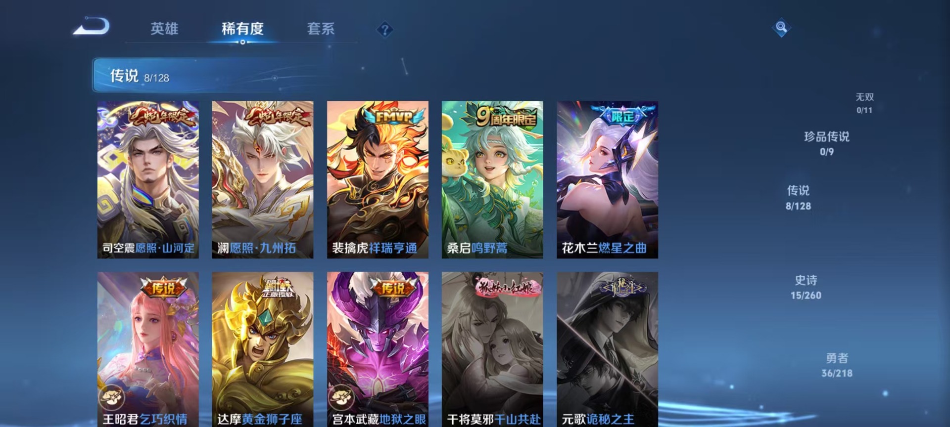 - [11818100]V7 2典藏 8传说 123英雄 231皮肤 可修改实名 优质装备:鸣剑·曳影,银白咏叹调(倪克斯侍卫),猫影幻舞,炽阳神光,一念神魔,云霓雀翎,地狱之眼,时之恋人-刘备(电焊工) 珍宝阁皮:优雅恋人,蔷薇恋人 限定皮:异界灵契(白毛香),高山流水,五谷丰年,天狼运算者,梁祝,天狼溯光者,天狼绘梦者,李小龙,朱雀志(守约年限),孙行者,猪悟能,青春决赛季,匿光追影者,女儿国国王,寅虎·御盾(廉颇年限),寅虎·赤拳(老虎年限) 史诗皮:紫霞仙子,苍穹之光,电玩小子(小书包),特工魅影,魅语,冰冠公主,偶像歌手,晚萤,暗夜猫娘,龙骑士(小龙虾),末日机甲-吕布,猫狗日记-孙策,猫狗日记-大乔,乱世虎臣,节奏热浪,修罗,女仆咖啡,摇滚巨星,水果甜心,绅士熊喵,天才门将,星夜王子,心灵骇客,时之奇旅-安琪拉,功夫厨神,德古拉伯爵,暗隐猎兽者,幽灵船长,鬼剑武藏,心灵战警,舞动绿茵,地狱岩魂,繁星吟游(呼啦呼啦),缤纷独角兽,乘风破浪,逐浪之夏,龙鼓争鸣,水晶猎龙者,曙光守护者,箭羽风息,金属风暴,原初追逐者,圣诞狂欢,圣诞恋歌,鹰眼统帅,暗夜贵公子,魅力维加斯,黎明之约,寅虎·御盾,未来纪元-赵云