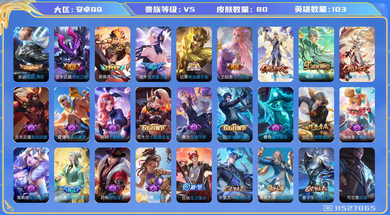 [11527065]V5 1典藏 8传说 103英雄 80皮肤 可修改实名 优质装备:鸣剑·曳影,黄金狮子座,地狱之眼,乞巧织情,燃星之曲 传说皮:祥瑞亨通 限定皮:愿照·九州拓(澜年限),愿照·山河定(司空震年限),鸣野蒿 史诗皮:器灵·浮梦炉,龙之律动,战舞者,百相守梦-黄忠,冰冠公主,节奏热浪,水果甜心,幽灵船长,鬼剑武藏,乘风破浪,水晶猎龙者,曙光守护者,圣诞狂欢,鹰眼统帅