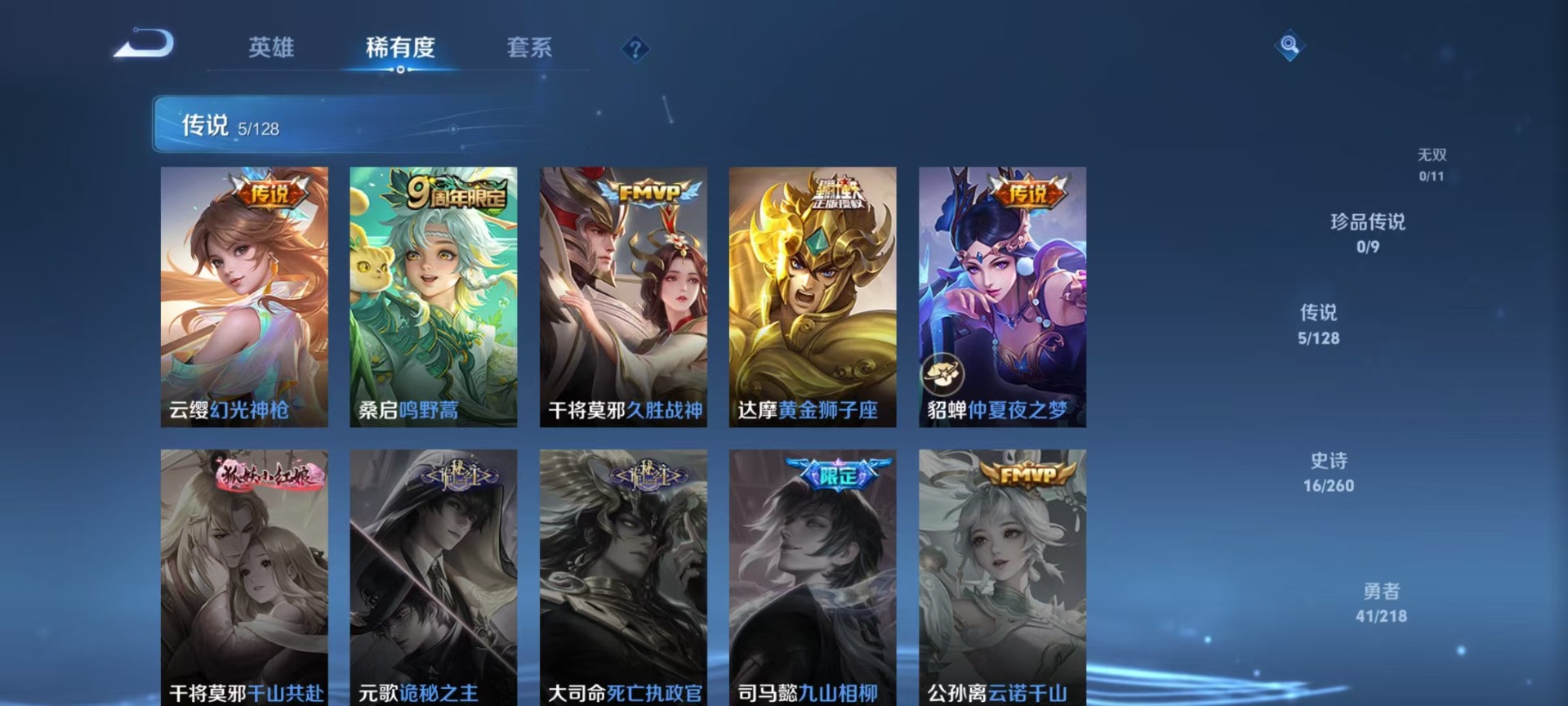 - [11600461]V8 1典藏 15传说 123英雄 306皮肤 可修改实名 优质装备:鸣剑·曳影,云鹰飞将(小将军),绛天战甲(鸡嘴战神),一念神魔,零号·赤焰,李逍遥,淬星耀世,无双飞将,琥珀纪元马超 传说皮:幻光神枪 珍宝阁皮:妄想食味,蔷薇恋人,女武神 限定皮:鸣野蒿,白虎志(电光耗子),时雨天司(水龙头),神威(电光马子),飞衡(韩信年限),高山流水,五谷丰年,青龙志(铠年限),冰锋战神,梁祝,御风骁将(吕布年限),天狼狩猎者,祈雪灵祝(雪兔子),李小龙,朱雀志(守约年限),默契交锋-兰陵王,孙行者,猪悟能,大圣娶亲,青春决赛季,乒乒小将,匿光追影者 史诗皮:龙之律动,石田雨龙,百相守梦-黄忠,紫霞仙子,电玩小子(小书包),白龙吟,特工魅影,千年之狐,江河有灵,百解令(蒙犽),偶像歌手,晚萤,电玩·爆裂旋风,末日机甲-吕布,猫狗日记-孙策,时之恋人-孙尚香,乱世虎臣,节奏热浪,修罗,女仆咖啡,摇滚巨星,水果甜心,天才门将,星夜王子,心灵骇客,功夫厨神,暗隐猎兽者,幽灵船长,鬼剑武藏,心灵战警,地狱岩魂,纤云弄巧,繁星吟游(呼啦呼啦),拒霜思,缤纷独角兽,乘风破浪,逐浪之夏,水晶猎龙者,曙光守护者,箭羽风息,金属风暴,圣诞狂欢,圣诞恋歌,鹰眼统帅,魅力维加斯,赏金猎手,无心,未来纪元-赵云
