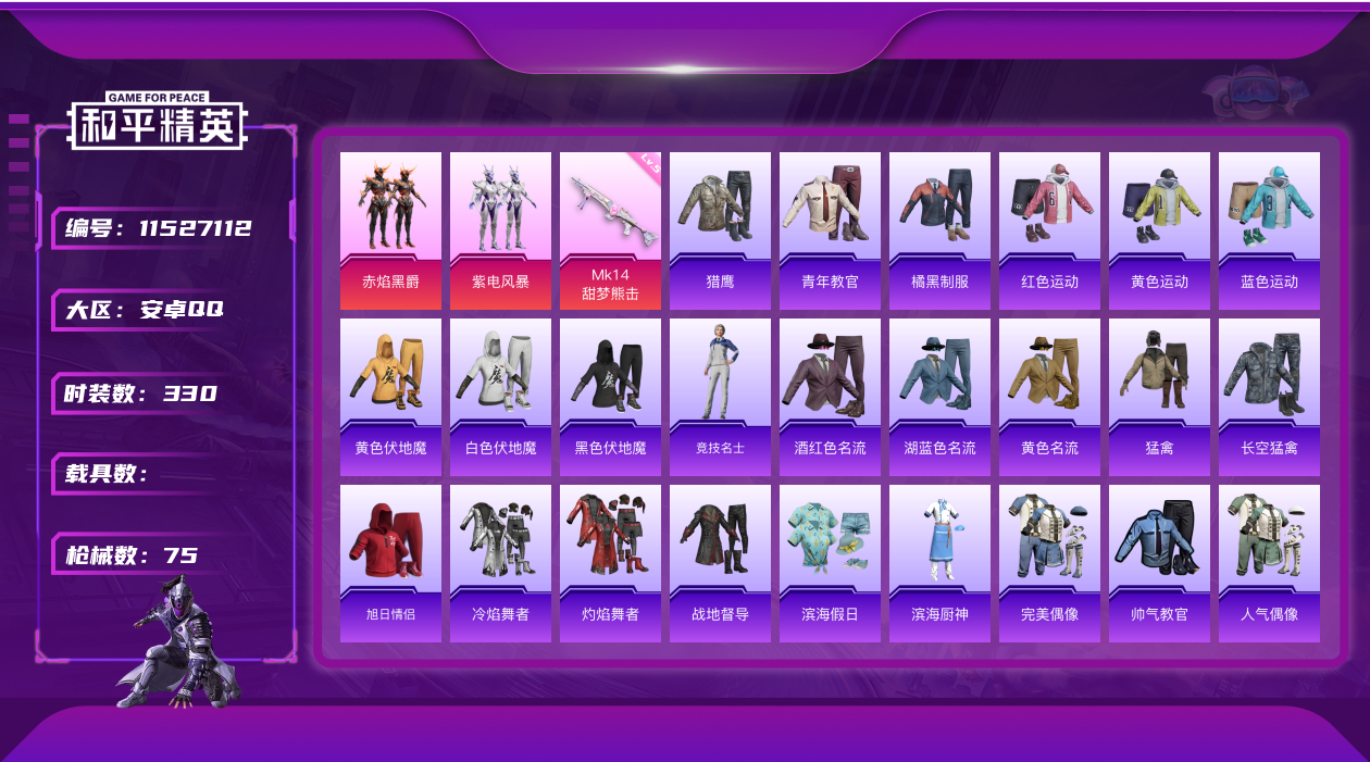 [11527112]2粉装 1特效枪 4印记 可二次 可修改实名 优质装备:MK14-甜梦熊击 热门装扮:紫电风暴,赤焰黑爵 五级特效枪:五级MK14-甜梦熊击 紫色装扮:田园牧歌,轻风白浪,SS22特训,娇憨猪猪,萌趣咩咩,SS21特训,人气偶像,冷焰舞者,旭日情侣,顶瓜瓜,SS20特训,SS16特训,萌趣颜团子,特种颜团子,飞驰魅影,音速流光,SS19特训,甜心亚梦,虚音幻奏,SS17特训,SS18特训,都市魅力,酒红色名流,酷潮明星,长空猛禽,霓虹街区,青年教官,风暴特警,缤纷果语,耀眼新星,蓝彩潮人,蓝色运动,虎虎生威吉莉,街头潮人,蜜露汐语,飞行日记,魅力单车,鹤鸣,麻辣教官,黄色伏地魔,黄色名流,黄色运动,黑色伏地魔,龙的传人,龟仙人,极地朋克,极速红龙,格斗先锋,橘黑制服,深蓝色名流,滨海假日,夏日音浪,完美偶像,帅气教官,幻世战舞者,战地督导,探宝勇士,湖蓝色名流,滨海厨神,绮丽涂鸦,白熊同盟,白色伏地魔,破蛋小黄鸡,福星高照,空投萌叽,竞技达人朋克,红色运动,甜蜜熊情侣,牛气冲天,灼焰舞者,猛禽,猎鹰,玉兔迎春,竞技名士,SS24特训(SS24特训套装),SS25特训,黑夜传说,大橘大利,耀粉歌者,光之冒险,海上生明月 优质战备:筑梦精灵降落伞