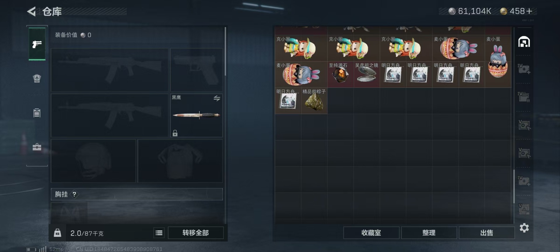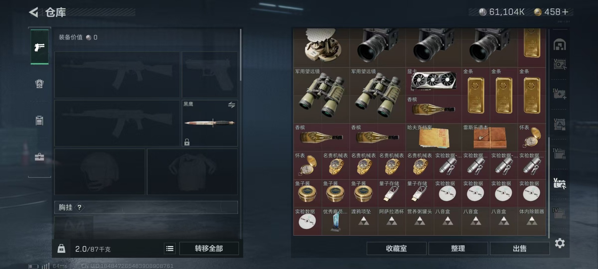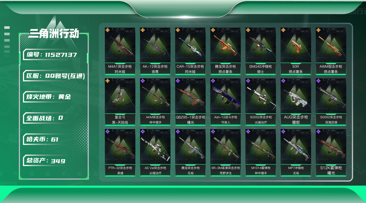 [11527137]总资产:349.6M 1干员外观 8传说枪械 哈夫币:61.104K 可二次 可修改实名 优质装备:顶级安全箱(3x3) 烽火地带段位:黄金 全面战场段位:军士长 传说武器皮肤:AK-12突击步枪-夜鹰,SMG45冲锋枪-骑士,93R-捞点薯条,AWM狙击步枪-捞点薯条,腾龙突击步枪-捞点薯条,CAR-15突击步枪-阿米娅,复合弓-黑-天际线,M4A1突击步枪-阿米娅 史诗武器皮肤:AUG突击步枪-蝮蛇,Ash-12战斗步枪-守夜人,AS Val突击步枪-尖端治疗,SG552突击步枪-尖端治疗,PKM通用机枪-荒野求生,SG552突击步枪-深海恐惧,AKM突击步枪-林中猎手,SR-3M紧凑突击步枪-荒野求生,M1014霰弹枪-林中猎手,PTR-32突击步枪-英雄,SVD狙击步枪-荒野求生,M250通用机枪-囚徒,腾龙突击步枪-无垢,MP7冲锋枪-无垢,PSG-1射手步枪-无垢,QBZ95-1突击步枪-曙光,沙漠之鹰-曙光,S12K霰弹枪-曙光,PKM通用机枪-英雄 干员外观:蜂医-送葬人·无题密令(S5)