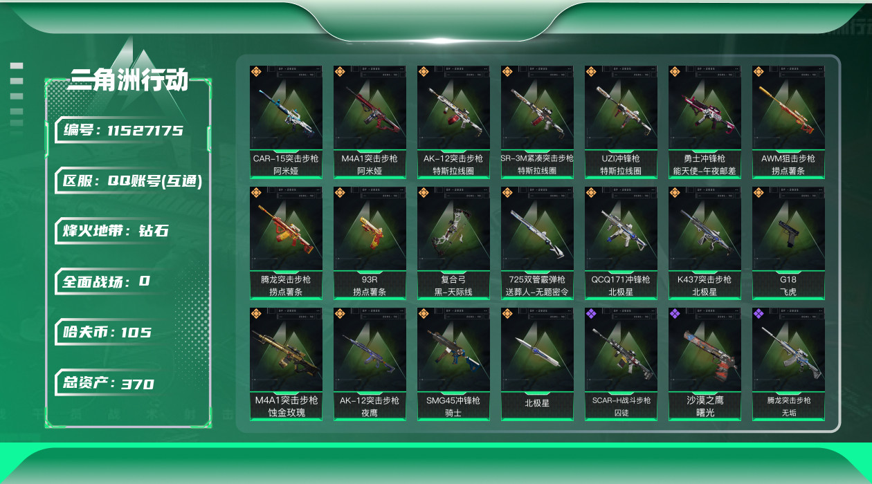 [11527175]总资产:370.3M 2干员外观 1近战传说 18传说枪械 哈夫币:105K 高级安全箱(2×3)9.15号到期 可二次 可修改实名 优质装备:近战-北极星 烽火地带段位:钻石 全面战场段位:列兵 传说武器皮肤:AK-12突击步枪-夜鹰,G18-飞虎,SMG45冲锋枪-骑士,M4A1突击步枪-阿米娅,CAR-15突击步枪-阿米娅,复合弓-黑-天际线,AWM狙击步枪-捞点薯条,QCQ171冲锋枪-北极星,腾龙突击步枪-捞点薯条,93R-捞点薯条,AK-12突击步枪-特斯拉线圈,SR-3M紧凑突击步枪-特斯拉线圈,UZI冲锋枪-特斯拉线圈,勇士冲锋枪-能天使-午夜邮差,725双管霰弹枪-送葬人-无题密令,K437突击步枪-北极星,M4A1突击步枪-蚀金玫瑰 史诗武器皮肤:SCAR-H战斗步枪-囚徒,腾龙突击步枪-无垢,沙漠之鹰-曙光 干员外观:红狼-蚀金玫瑰,威龙-飞虎