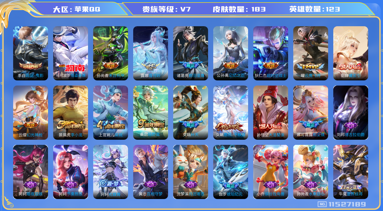 [11527189]V7 1典藏 1珍品传说 12传说 123英雄 182皮肤 可修改实名 优质装备:鸣剑·曳影,怪盗基德,云鹰飞将(小将军),末日机甲-孙尚香(绿蚂蚱),超时空战士-狄仁杰,记忆之芯(机甲兔),鹤羽星尊,霜月吟 传说皮:貂蝉曦玄引,幻光神枪 珍宝阁皮:妄想食味 限定皮:愿照·千秋盛(女娲年限),鸣野蒿,补天,前尘镜,梁祝,李小龙,大圣娶亲 史诗皮:赞萌露比,器灵·浮梦炉,化蝶舞,星界战将,谪仙醉月,龙之律动,战舞者,蒙犽顽岩魄,琥珀纪元伽罗,百相守梦-百里守约,星界特工,百相守梦-黄忠,守夜人,电玩小子(小书包),特工魅影,永昼,冰冠公主,偶像歌手,晚萤,暗夜猫娘,龙骑士(小龙虾),节奏热浪,摇滚巨星,水果甜心,天才门将,心灵骇客,德古拉伯爵,暗隐猎兽者,鬼剑武藏,暗渊魔法,心灵战警,舞动绿茵,纤云弄巧,缤纷独角兽,逐浪之夏,月团寄思,水晶猎龙者,金属风暴,原初追逐者,圣诞狂欢,圣诞恋歌,鹰眼统帅,魅力维加斯,黎明之约,赏金猎手