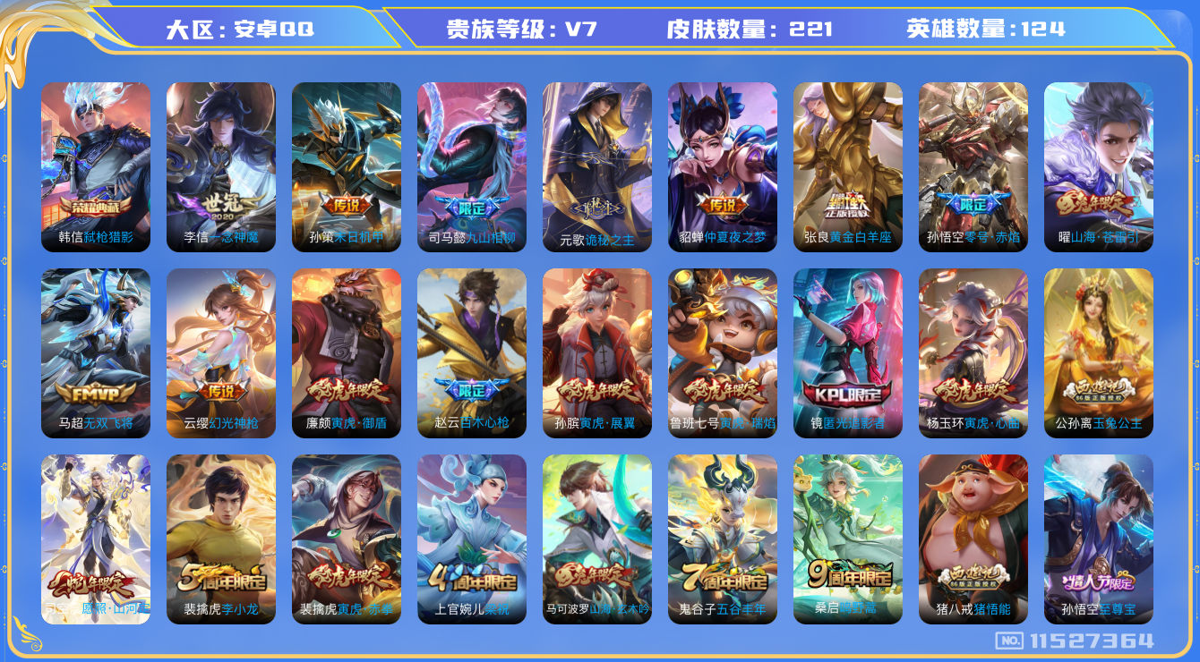 [11527364]V7 1典藏 15传说 124英雄 221皮肤 可修改实名 优质装备:弑枪猎影(韩信典藏),黄金白羊座,一念神魔,仲夏夜之梦(大飞蛾),零号·赤焰,末日机甲-孙策,无双飞将,山海·苍雷引(电光曜子),诡秘之主 传说皮:九山相柳,幻光神枪 珍宝阁皮:妄想食味,蔷薇恋人,女武神 限定皮:愿照·九州拓(澜年限),愿照·山河定(司空震年限),鸣野蒿,至尊宝,傲雪梅枪,寅虎·展翼(孙膑年限),五谷丰年,冰锋战神,梁祝,李小龙,猪悟能,匿光追影者,寅虎·御盾(廉颇年限),寅虎·瑞焰(虎皮蛋子),寅虎·心曲(虎婆),寅虎·赤拳(老虎年限),百木心枪,玉兔公主,山海·玄木吟(马可年限) 史诗皮:器灵·浮梦炉,化蝶舞,星界战将,谪仙醉月,龙之律动,石田雨龙,茶境仙,战舞者,百相守梦-黄忠,紫霞仙子,特工魅影,千年之狐,永昼,江河有灵,魅语,高渐离燃音魔法,蒙恬荣光圣徽,冰冠公主,偶像歌手,暗夜猫娘,末日机甲-吕布,猫狗日记-孙策,乱世虎臣,节奏热浪,女仆咖啡,摇滚巨星,水果甜心,天才门将,星夜王子,心灵骇客,功夫厨神,德古拉伯爵,暗隐猎兽者,幽灵船长,鬼剑武藏,暗渊魔法,地狱岩魂,纤云弄巧,乘风破浪,逐浪之夏,水晶猎龙者,曙光守护者,金属风暴,原初追逐者,圣诞狂欢,鹰眼统帅,魅力维加斯,赏金猎手,寅虎·御盾,无心