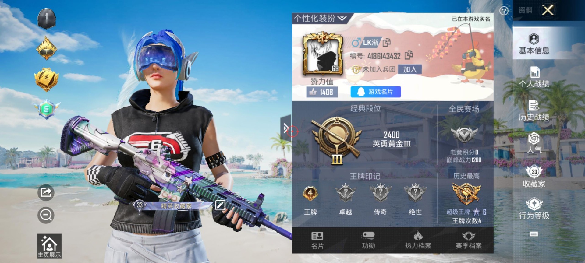 - PX_2096109- 安卓微信-2王牌印记-3粉装-1特效枪-1载具-13122热力值-27套装-44枪皮-2卓越印记-0传奇印记 【3粉装】,宁雨蝶,天穹,罗征 【1特效枪】M416-灵猫魔法师-3级 【2稀有紫装】,暗影哥特,浪漫天命, 【1稀有载具】,黑曜夜骑, 【27稀有时装】,SS33特训,SS32特训,彩虹兔,雪绒豹,SS34特训,朱霞炽焰,浪漫天命,暗影哥特,凌霄紫焰,蜜露汐语,