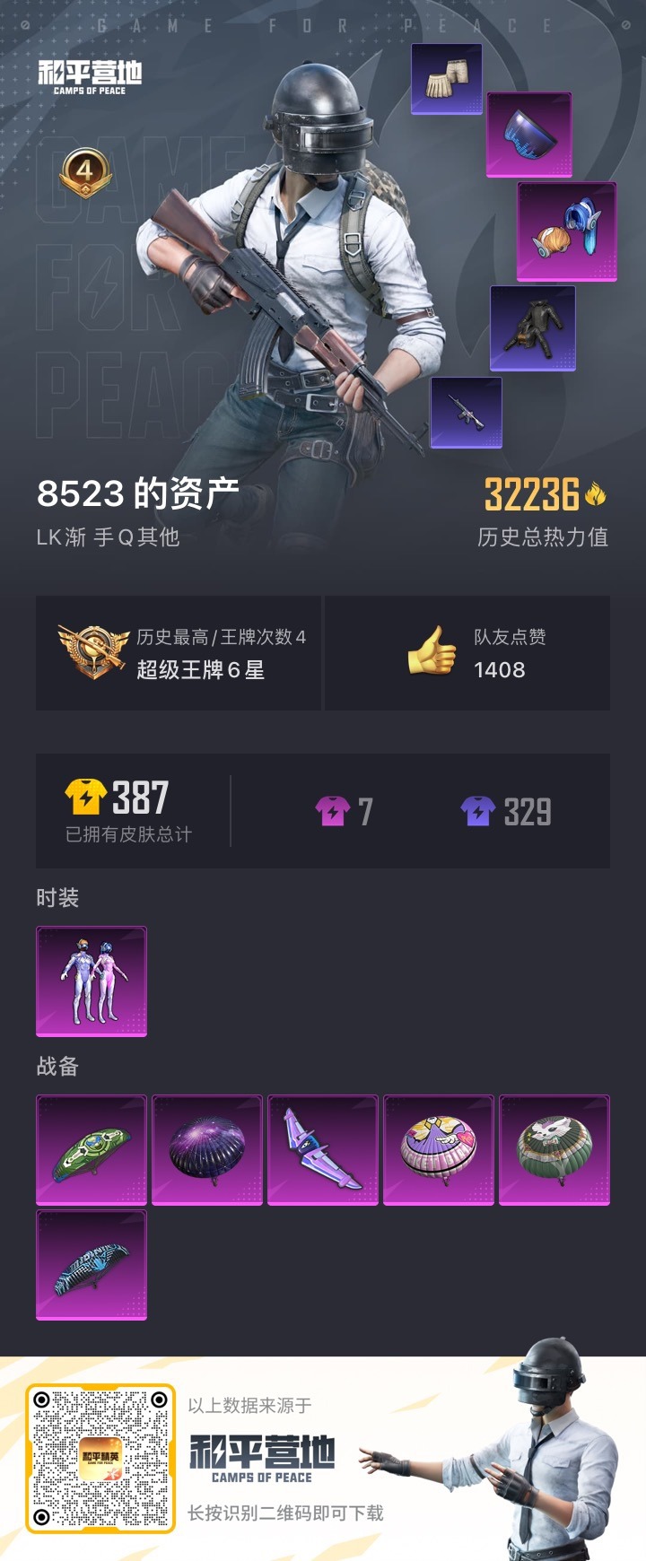 - [12322518]9粉装 15特效枪 2载具 16印记 可二次 可修改实名 身法装备:都市猎人,暗影哥特(红眼罩),冥河战士(老木乃伊),ACT追光队服,萌熊伴侣背包(粉熊背包) 优质装备:冥河战士(老木乃伊),木乃伊套装(老)(冥河战士),雪国幻梦(冰雪女王),兰博基尼Estoque(银翼灰),都市猎人,萌熊伴侣背包(粉熊背包),AKM炫紫旋律,M416心之恋语,奇异狩猎者,梦幻火箭(新101)(新火箭少女101粉色套装),新星烈龙(小白龙),AKM梦之光华,M416风花雪月,SCAR-L纯梦嫁纱,AUG超新星,MG3酷泡奶龙,GROZA-镜光银凌,AKS-74U-信仰神谕,破片手榴弹-热量炸弹,星穹咏叹调,MK14-甜梦熊击,Kar98K-巳巳如意 热门装扮:俏雪含霜,妙趣可丽,仲夏莫吉托,阿尔茜,炫光之旅,兔兔白日梦,动感兔斯基,胖达团团,激萌罗小黑,大橘为重,鹰眼刺客,深海小丑鱼,都市猎人,银碳小老虎 载具:冰绡玉鳞 稀有枪皮:P90-魔童闹海 敖丙,SCAR-L-魔童闹海 哪吒,DP-28-豹影疾电 六级特效枪:六级AUG-超新星 五级特效枪:五级GROZA-镜光银凌,五级AKS-74U-信仰神谕,五级M416-心之恋语,五级Kar98K-巳巳如意,五级DP-28-豹影疾电,五级MK14-甜梦熊击,五级破片手榴弹-热量炸弹,五级MG3-酷泡奶龙,五级AKM-梦之光华 三级特效枪:三级P90-魔童闹海 敖丙,三级SCAR-L-魔童闹海 哪吒 二级特效枪:二级M416-风花雪月 一级特效枪:一级AKM-炫紫旋律,一级SCAR-L-纯梦嫁纱 紫色装扮:幻彩翩翩,SS23特训,妙红点点,SS30特训套装,SS31特训套装,云朵鹅,彩虹兔,雪绒豹,SS33特训套装,旭日情侣,灵蜜圈圈,飞狐塔尔斯,SS21特训,绚烂繁星,田园牧歌,轻风白浪,和煦暖阳,SS22特训,香榭午后,龙舌兰冰茶,顶瓜瓜,北国孤狼,坚韧舞者,夏日倾情,夏日音浪,幻世战舞者,萌趣咩咩,六六大吉,军械专家,娇憨猪猪,SS16特训,瑞龙福将,团圆交子,醒狮腾龙,SS17特训,迪迦奥特曼,SS20特训,香草威化,甜心亚梦,虚音幻奏,怒火燎原,异彩先驱,SS18特训,雪兔飞飞,飞驰魅影,音速流光,极速竞梦,SS19特训,飞行日记,魅力单车,鹤鸣,麻辣教官,黄色伏地魔,黎明保卫者,黑色伏地魔,龙的传人,龙腾端午,龟仙人,蝶变