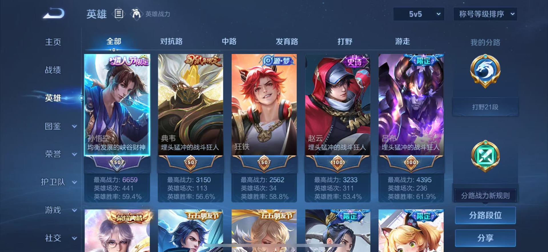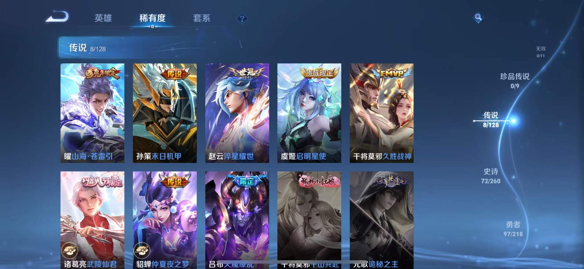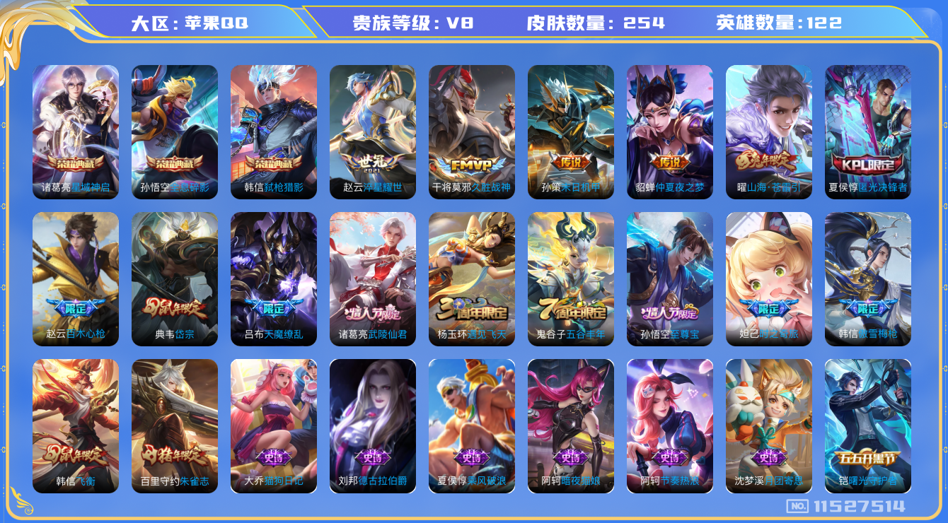 [11527514]V8 3典藏 8传说 122英雄 254皮肤 可修改实名 优质装备:全息碎影(猴子典藏),星域神启(倪克斯贼亮),弑枪猎影(韩信典藏),久胜战神,仲夏夜之梦(大飞蛾),淬星耀世,末日机甲-孙策,山海·苍雷引(电光曜子) 珍宝阁皮:玩趣恶龙 限定皮:至尊宝,武陵仙君(小桃花),傲雪梅枪,飞衡(韩信年限),遇见飞天,匿光决锋者,五谷丰年,岱宗(典韦年限),朱雀志(守约年限),天魔缭乱,百木心枪,时之奇旅-妲己 史诗皮:龙之律动,石田雨龙,紫霞仙子,特工魅影,千年之狐,江河有灵,无限星赏官,冰冠公主,偶像歌手,晚萤,暗夜猫娘,龙骑士(小龙虾),末日机甲-吕布,猫狗日记-孙策,猫狗日记-大乔,乱世虎臣,节奏热浪,女仆咖啡,摇滚巨星,水果甜心,绅士熊喵,天才门将,星夜王子,心灵骇客,功夫厨神,德古拉伯爵,暗隐猎兽者,幽灵船长,鬼剑武藏,心灵战警,舞动绿茵,地狱岩魂,缤纷独角兽,乘风破浪,逐浪之夏,月团寄思,水晶猎龙者,曙光守护者,箭羽风息,金属风暴,圣诞狂欢,圣诞恋歌,鹰眼统帅,暗夜贵公子,魅力维加斯,赏金猎手,无心,未来纪元-赵云