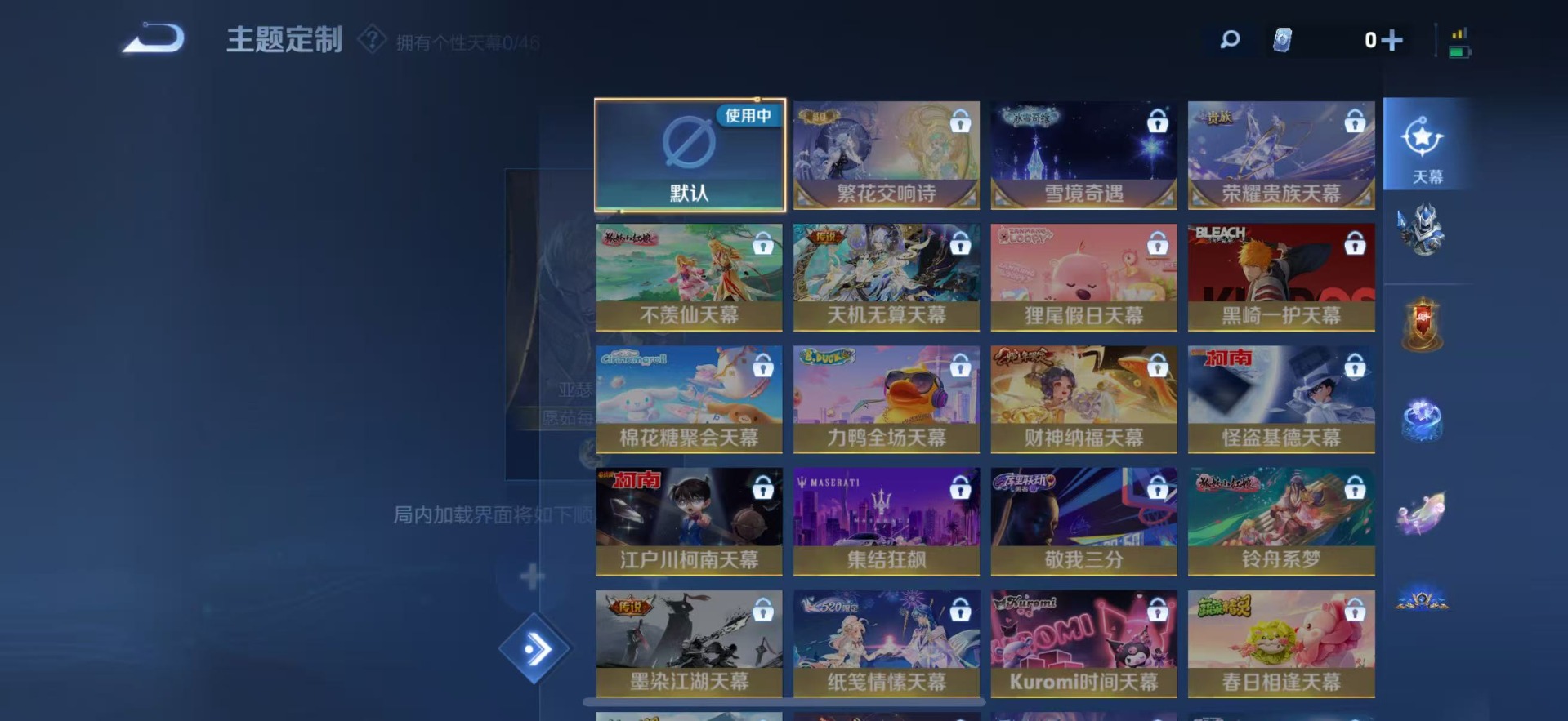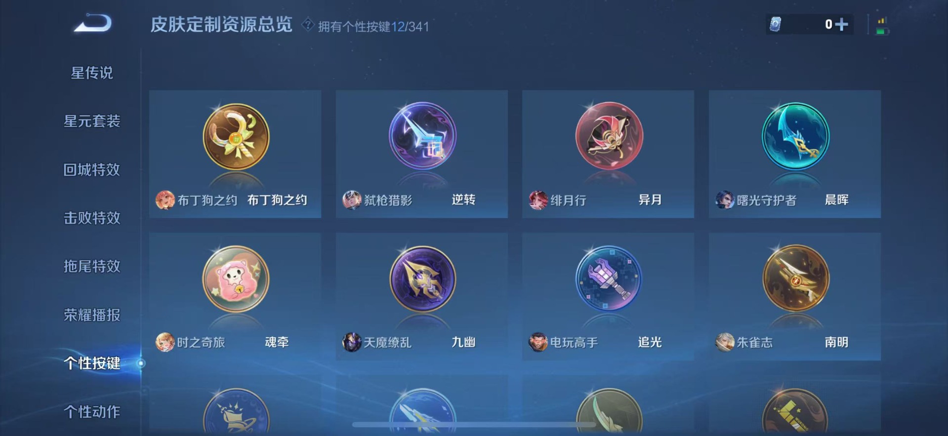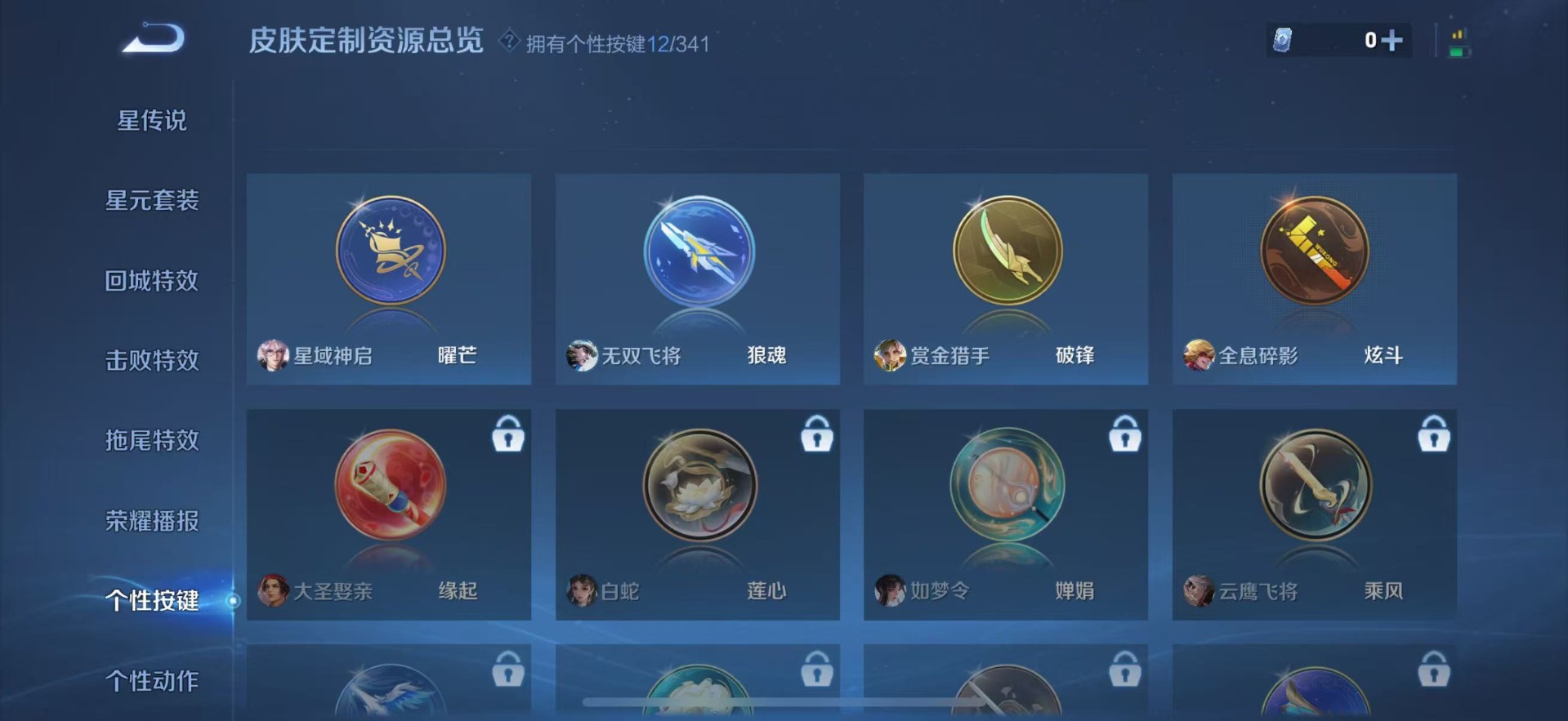 大乔猫狗日记,刘邦德古拉伯爵,夏侯惇乘风破浪,阿轲暗夜猫娘,阿轲节奏热浪,铠曙光守护者,曹操幽灵船长,伽罗箭羽风息,廉颇地狱岩魂,小乔缤纷独角兽,孙策猫狗日记,吕布圣诞狂欢,露娜紫霞仙子,吕布末日机甲,刘禅天才门将,刘禅绅士熊喵,宫本武藏鬼剑武藏,公孙离无限星赏官,兰陵王暗隐猎兽者,貂蝉圣诞恋歌,花木兰水晶猎龙者,李白千年之狐,安琪拉心灵骇客,白起星夜王子,亚瑟心灵战警,嬴政摇滚巨星,嬴政暗夜贵公子,程咬金功夫厨神,雅典娜冰冠公主,百里守约特工魅影,李元芳逐浪之夏,墨子龙骑士,墨子金属风暴,蔡文姬舞动绿茵,澜赏金猎手,娜可露露晚萤,王昭君偶像歌手