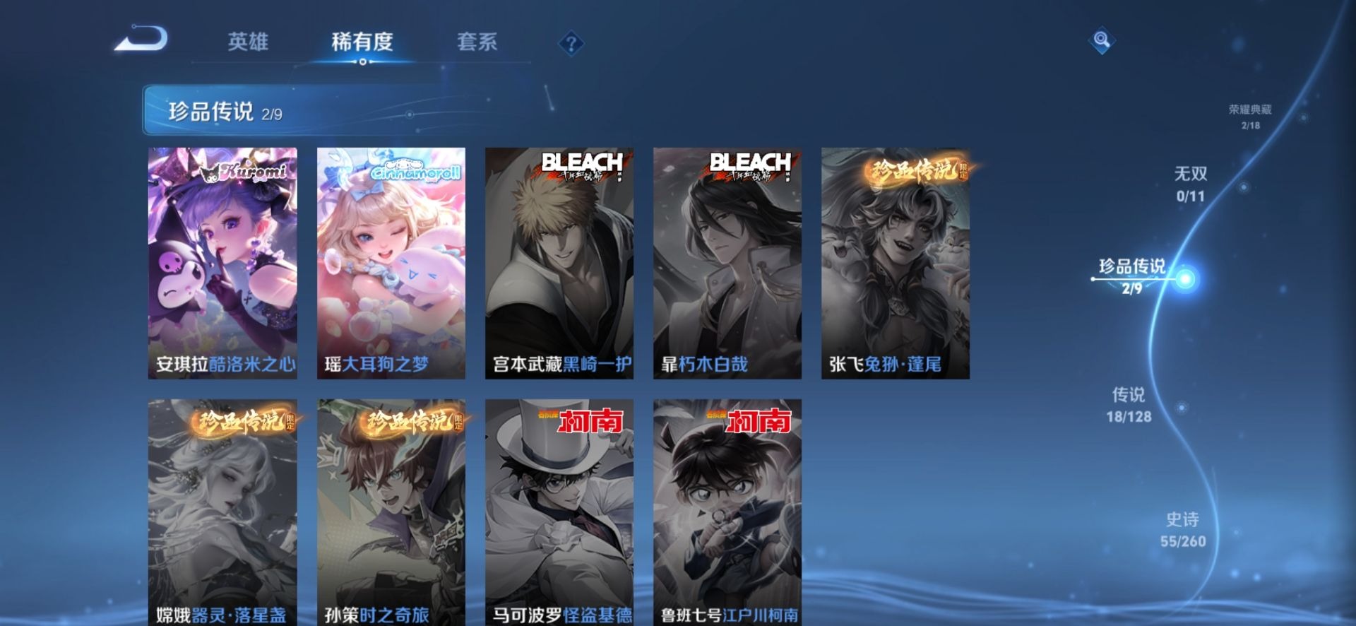 - PX_2099956-Q/至尊星耀/257皮肤/122英雄/0典藏/0珍品无双/0无双/0珍品传说/18传说/64史诗/7稀有英雄 【18 传说皮肤】胖达荣荣 梦奇,启明星使 虞姬,逐花归海 澜,无双飞将 马超,齐天大圣 孙悟空,猫影幻舞 貂蝉,地狱之眼 宫本武藏,炽阳神光 镜,黄金射手座 后羿,怒海麟威 吕布,黄金狮子座 达摩,久胜战神 干将莫邪,山海·炽霜斩 李信,一念神魔 李信,音你心动 小