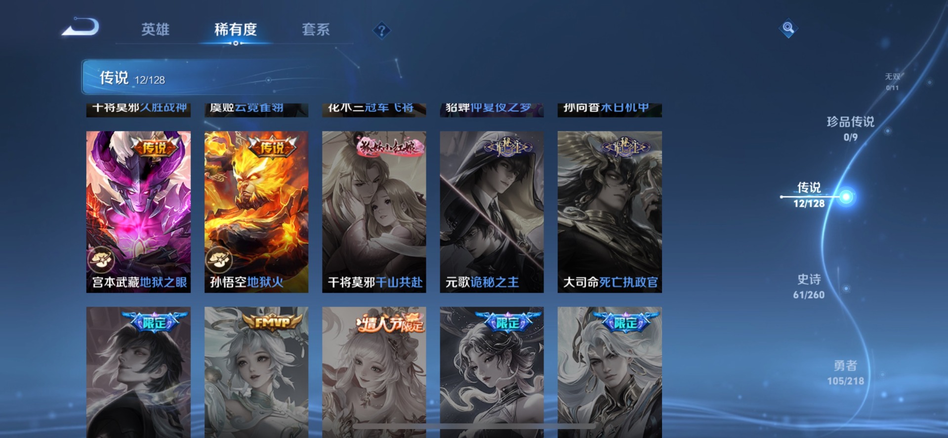 铠青龙志,伽罗太华,赵云百木心枪,典韦岱宗,后羿如梦令,诸葛亮时雨天司,裴擒虎李小龙,裴擒虎天狼狩猎者,上官婉儿梁祝,桑启鸣野蒿,孙悟空大圣娶亲,孙悟空至尊宝,赵云引擎之心,妲己时之彼端,韩信飞衡,韩信逐梦之影