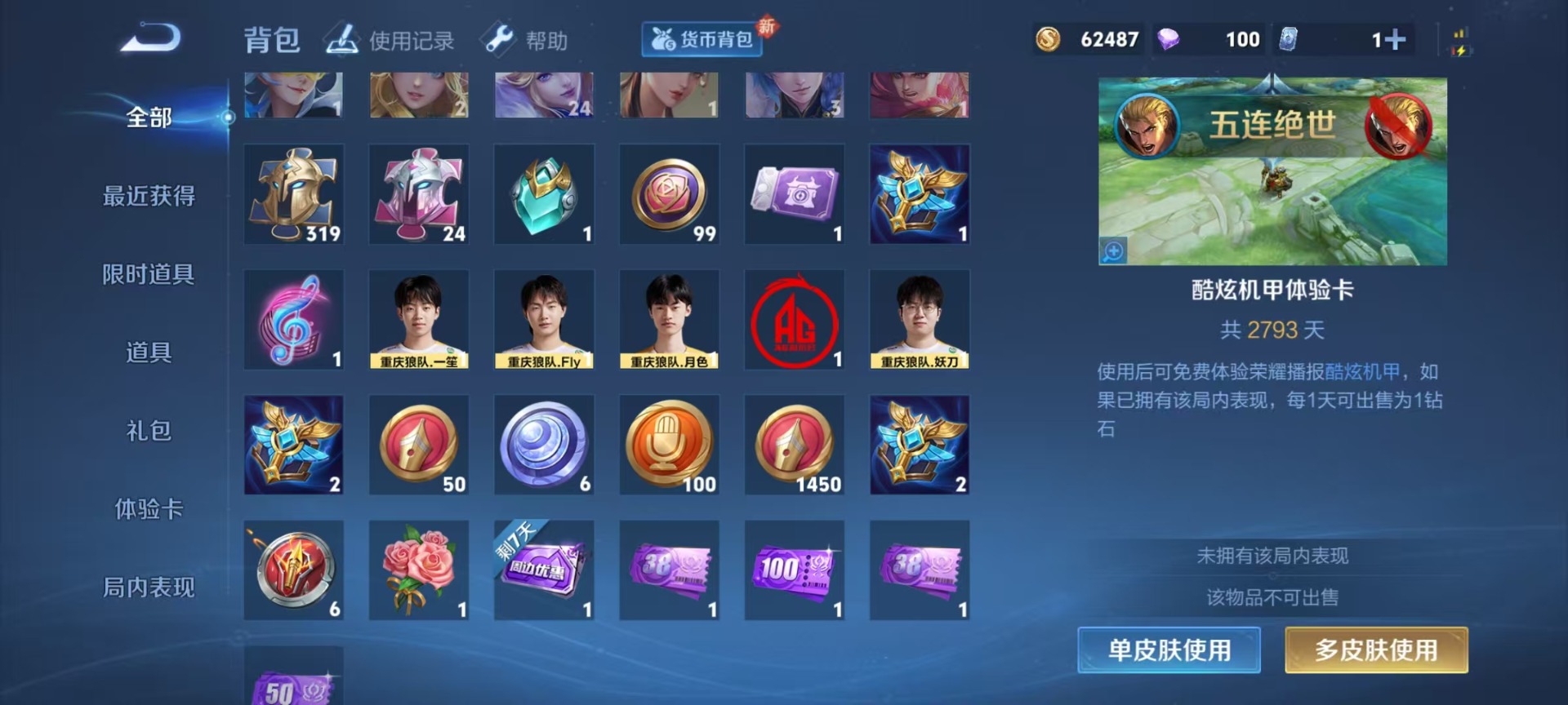 - [12090147]16橙皮 1金皮 8紫皮 73皮肤 23英雄 100卡面 850已用源晶 铂金 优质装备:冥驹-偃月苍龙,狂徒-塑水宗,狂徒-混沌序曲,狂徒-掠影,狂徒-紫阙金琅,狂徒-盖亚的复仇,幻影-侦察力量,獠犬-781-A协议,正义-千灵华绽,正义-掠影,冥驹-起源,戍卫-天界神兵,紫金爪刀,飞将-塑水宗,判官-千灵华绽,爪刀-RGX 11z Pro 3.0,匕首-超限闪存,影刃,荒土机兵热能刀,雄鹿-起源 佩枪皮肤:标配-VCT25xKRU,正义-西部未来 步枪皮肤:狂徒-双城之战 狙击枪皮肤:莽侠-RGX 11z Pro 3.0 近战武器皮肤:超能偶像 应援棒