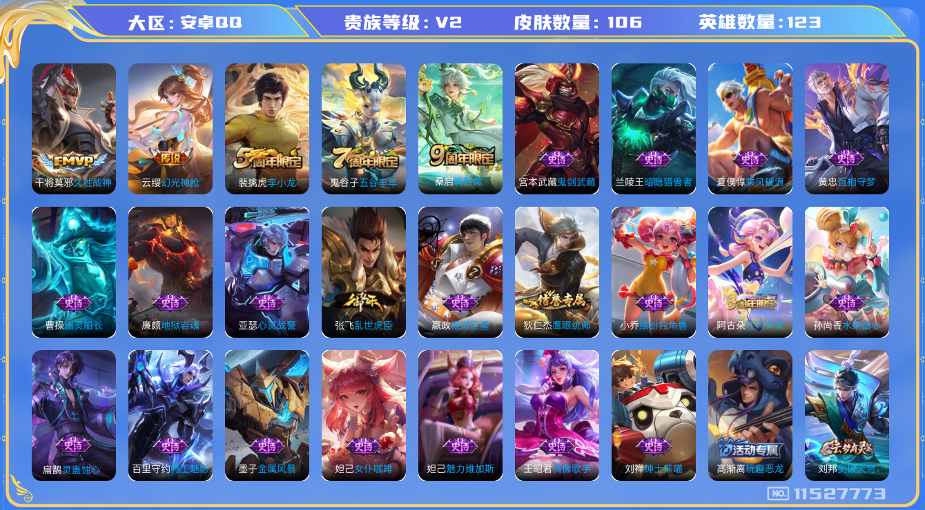 [11527773]V2 3传说 123英雄 106皮肤 可修改实名 优质装备:久胜战神 传说皮:幻光神枪 珍宝阁皮:玩趣恶龙 限定皮:鸣野蒿,五谷丰年,李小龙 史诗皮:灵蛊蚀心,百相守梦-黄忠,特工魅影,江河有灵,偶像歌手,乱世虎臣,女仆咖啡,摇滚巨星,水果甜心,绅士熊喵,暗隐猎兽者,幽灵船长,鬼剑武藏,心灵战警,地狱岩魂,缤纷独角兽,乘风破浪,金属风暴,鹰眼统帅,魅力维加斯
